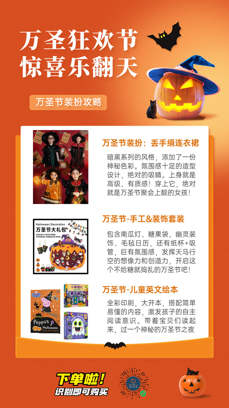 小朋友心心念念的万圣节,终于要来了,又多了一个光明正大“装扮”的理由,今年想要什么装扮出街呢?来看看给大家带来的万圣节新品,在这个万圣节前夜,与家长们一起开始一些亲子手工,发挥天马行空的想像力和创造力,开启这个“不给糖就捣乱的万圣节”吧!