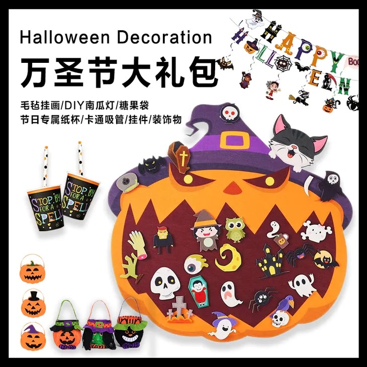 1、南瓜灯🎃、糖果袋🍬,幽灵装饰👻万圣节、毛毡日历📅,纸杯+吸管,巨巨巨有氛围感
