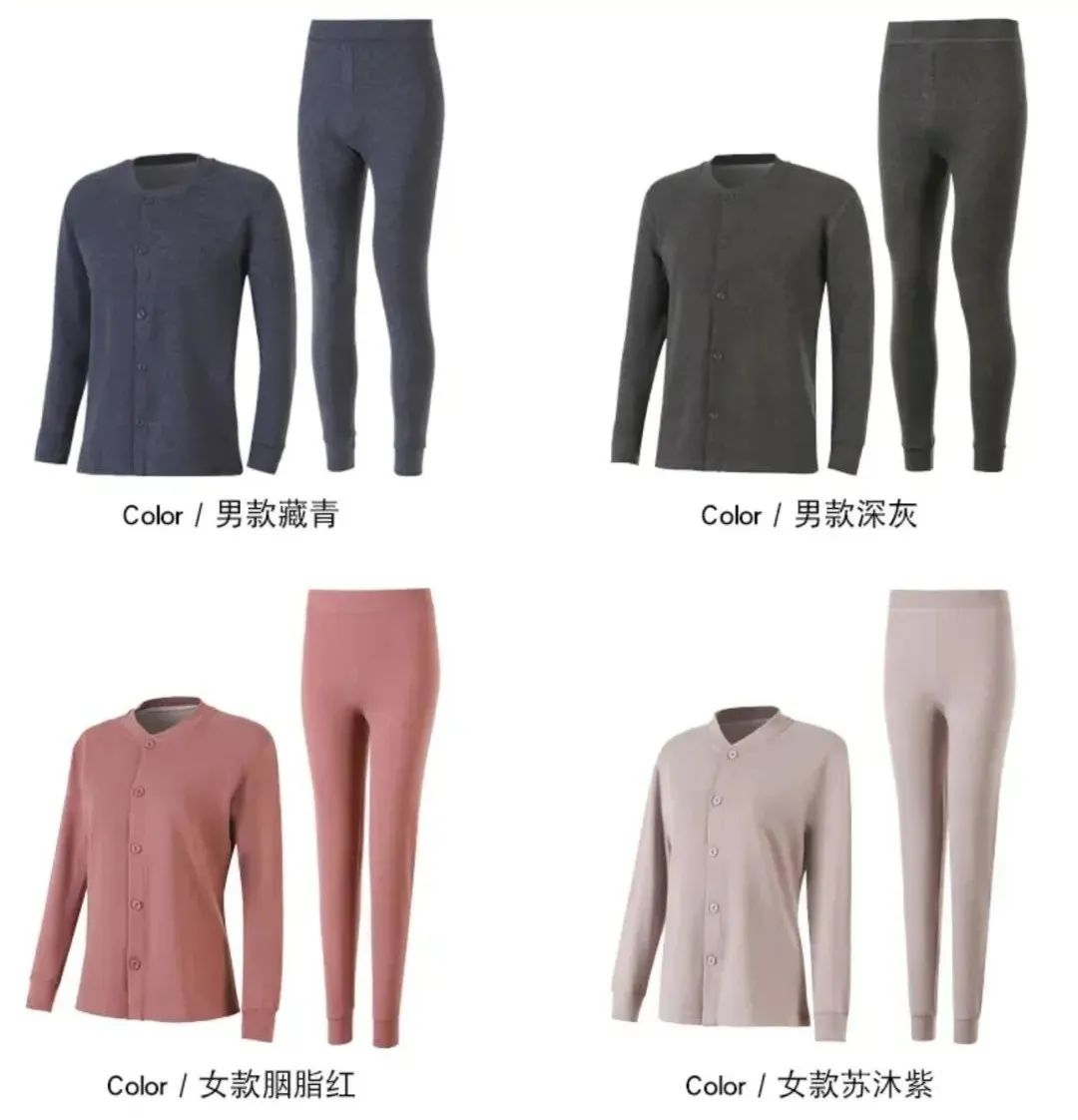 男女同款,男款有藏青和深灰色,女款是胭脂红和苏沐紫。尺码从L到3XL,可以根据身高体重选择合适的尺码。保暖、舒适,这样一套保暖套装简直就是送父母、长辈的贴心礼物~爸妈、爷奶不知道怎么买,自己都是在路边随便买的,便宜是便宜,但质量差,穿着不舒服啊。蓝哚这套质量好,还是添加了羊毛+桑蚕丝的,各方面的细节也做的很贴心。比起你给钱、买吃的,这种送进心窝的礼物才是真正的暖心~