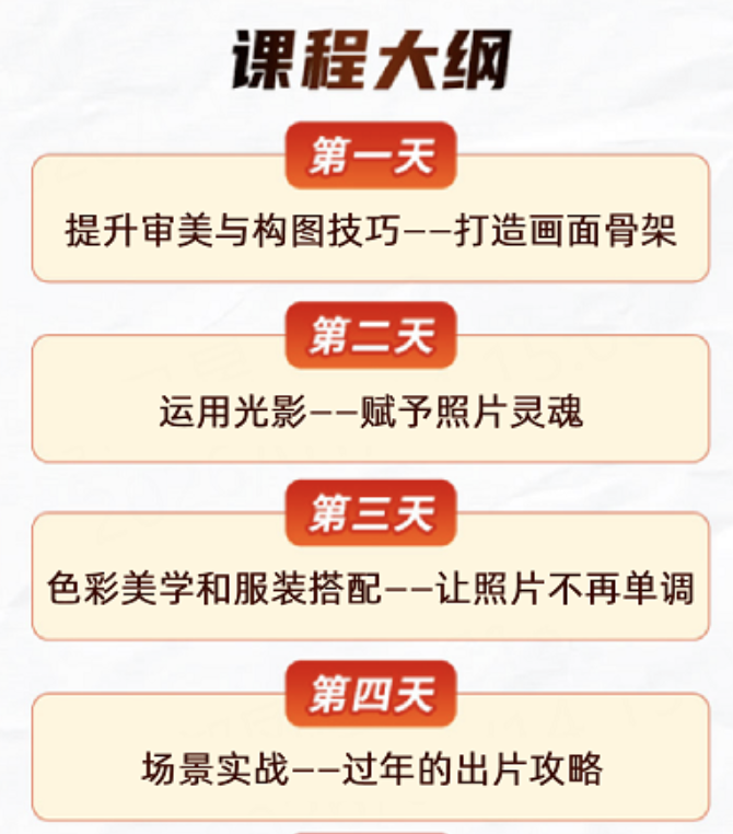 本次课程共4天,每节课都会教你2-3个实用可行的摄影技法。