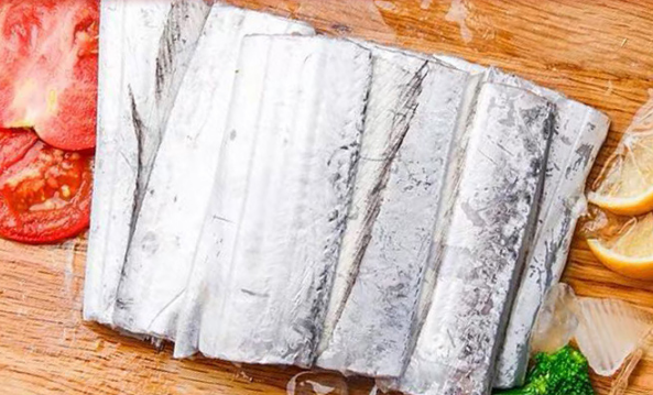 捕捞上岸的刀鱼,快速去尾去内脏,选取肉质肥美部位切断而成。鱼身呈银白色,肉厚刺少,肉质细嫩。