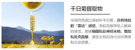 千日菊提取物:带来特别的“震动感”、唤醒私处的神经末梢、增加充血量、激发女性自身的爱液分泌、唤起欲望。