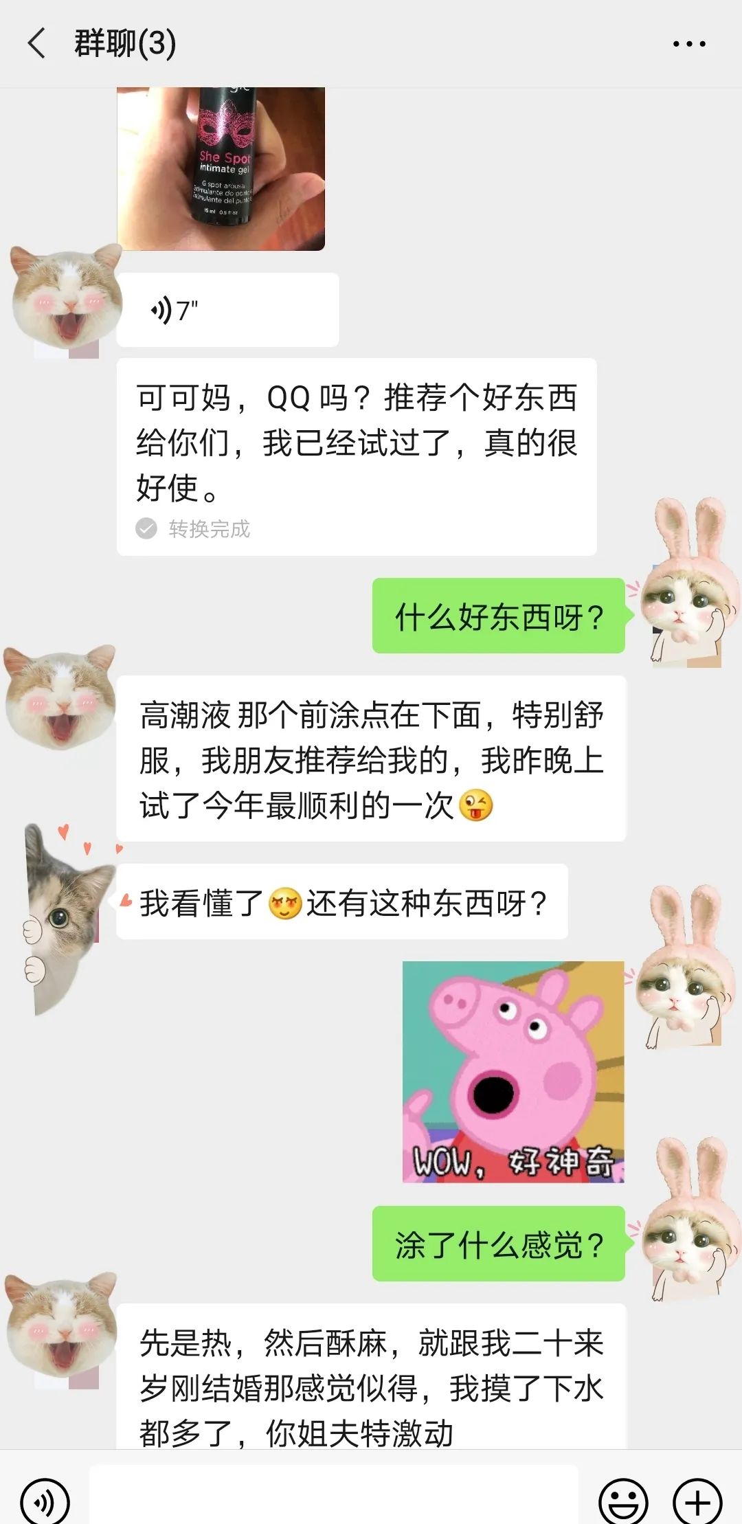 后来没过几天,这位姐妹被甜甜妈拉到一个微信群里,然后她神秘兮兮地跟另外俩说,她找到一个好东西,夫妻生活前涂一点,效果特好。