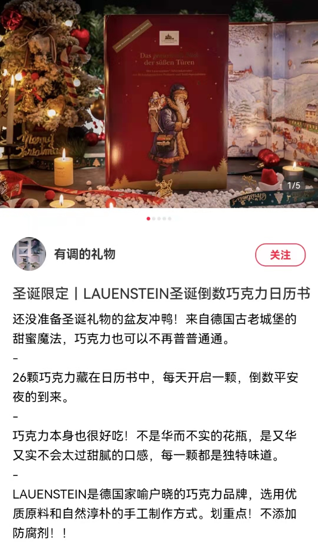 LAUENSTEIN城堡巧克力在制作的时候坚决不添加任何防腐剂,只用德国当季最新鲜的坚果、水果与材料。为了不影响巧克力的口感,所以这款圣诞礼盒只有在每年11月份才会上线,圣诞过后就没有了,仅有短短2个月的售卖期,可以说是独一无二的限量版,想吃的小伙伴们可要抓紧下手啦!