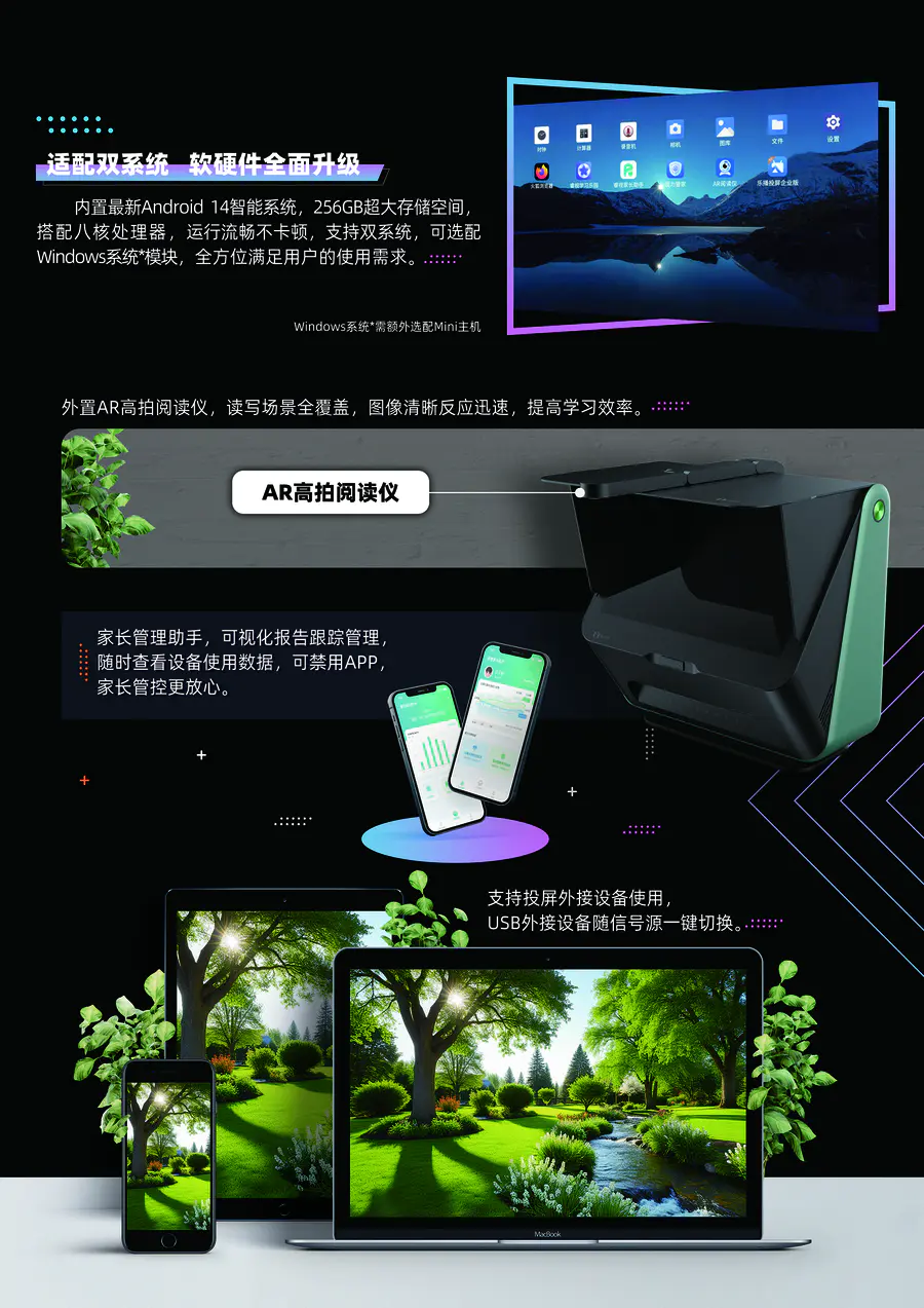 支持最新Android14智能系统及Windows系统*,8+256GB超大存储,满足丰富的应用安装和用户学习内容需求