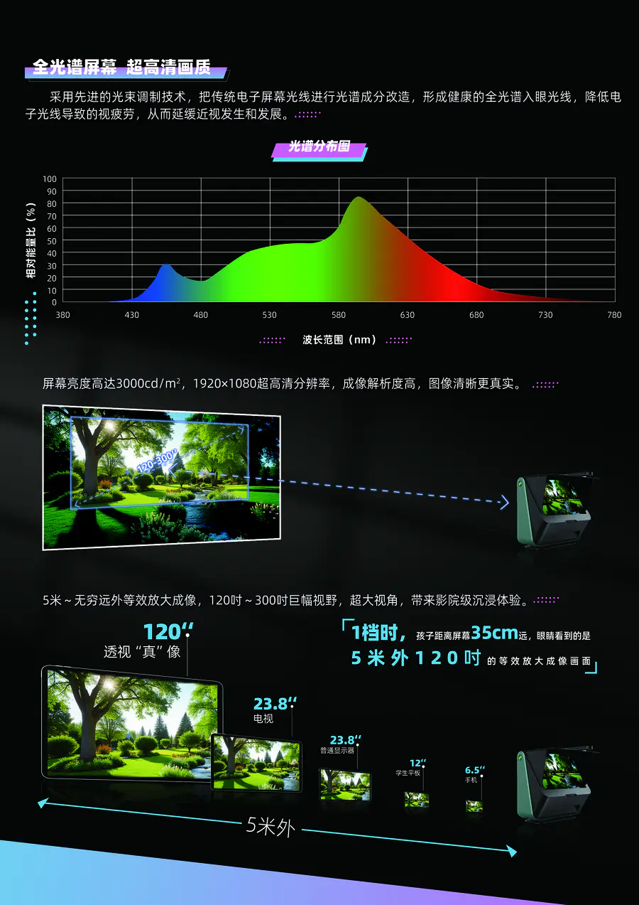 4.屏幕为超高亮度全光谱屏,光学成像进一步提升,入眼光线更舒适