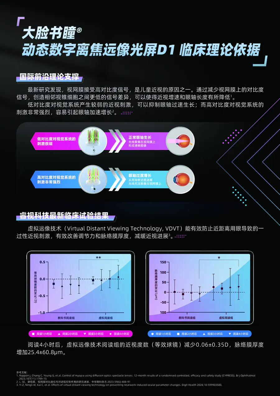 动态数字离焦远像光屏D1多维度全面升级,包含拉远、离焦、DOT、雾视、全光谱等多维度防控手段,近视管理黑科技