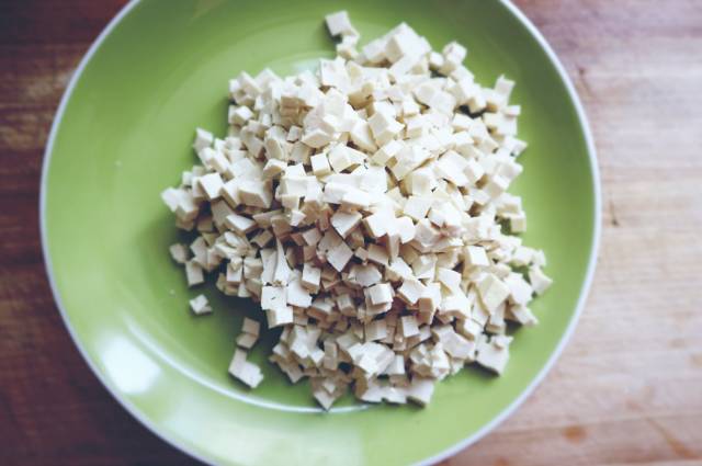 4、豆腐切成小丁备用;