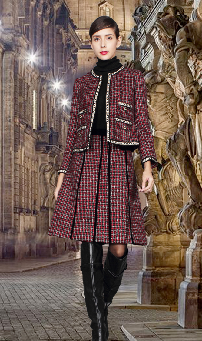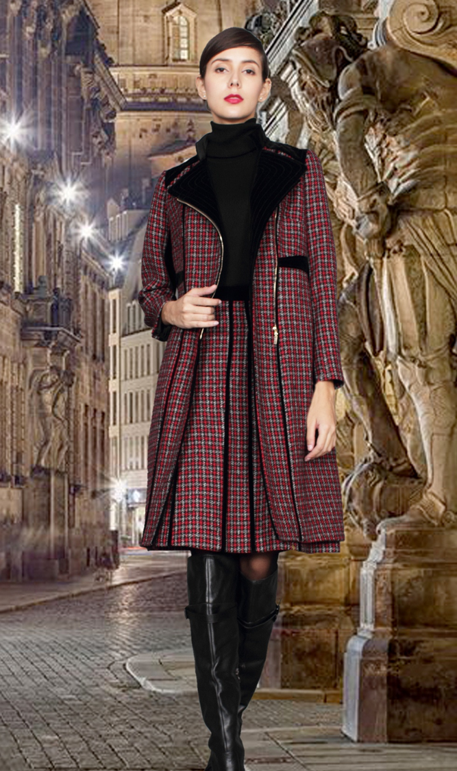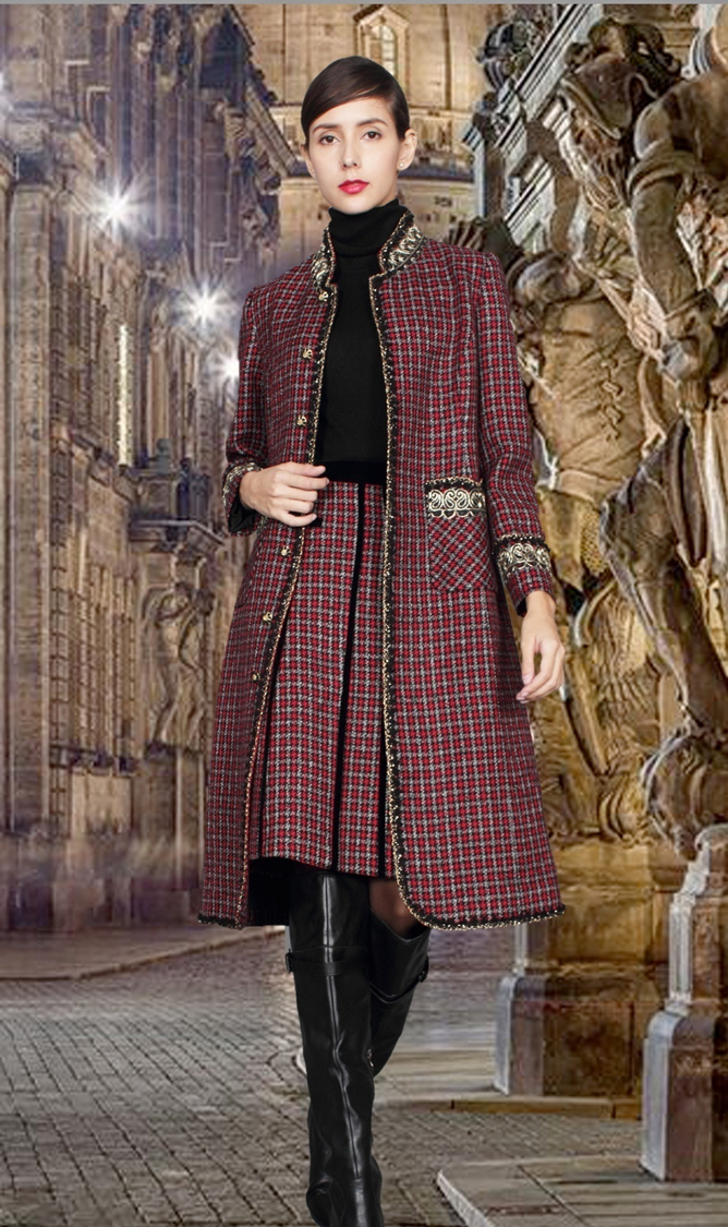 经典千鸟格,永不落于时尚之后,粗纺呢料,品质与保暖兼具。修身长款,简约时尚,金丝花边,华丽感十足,再现。