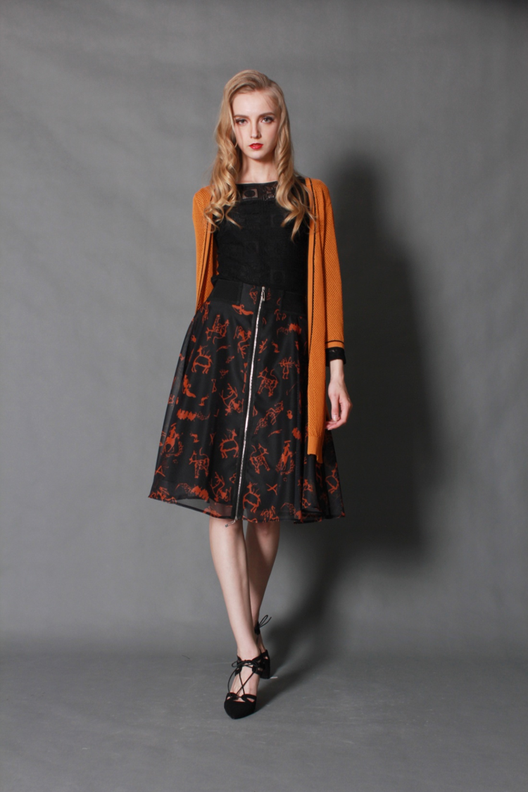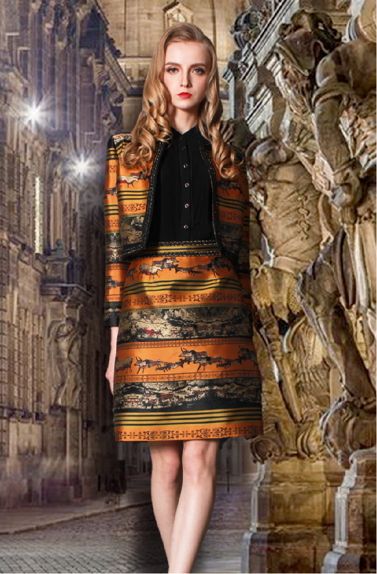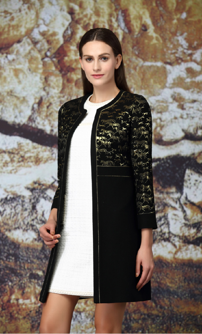 灵感来源于1.7万年前法国拉斯科大厅洞窟壁画,立体金线提花,远古时代的艺术与现代技术的结合,让您的艺术气息溢出百米之外。金线提花面料,精细高品。混料拼撞,提升时尚度。H版型,合体包容,女王范。