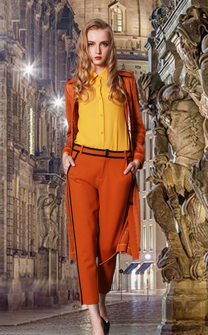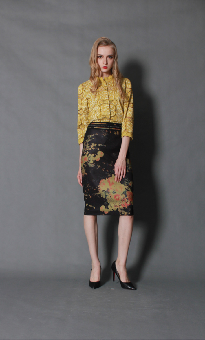 源自于1.7万年前法国拉斯科大厅洞窟壁画的岩石黄,示意你对艺术的钟爱。蕾丝精织,为你的性感代言。让你优雅中透露柔美的一面,领袖口的精贴花边,显出你对精致的追求。