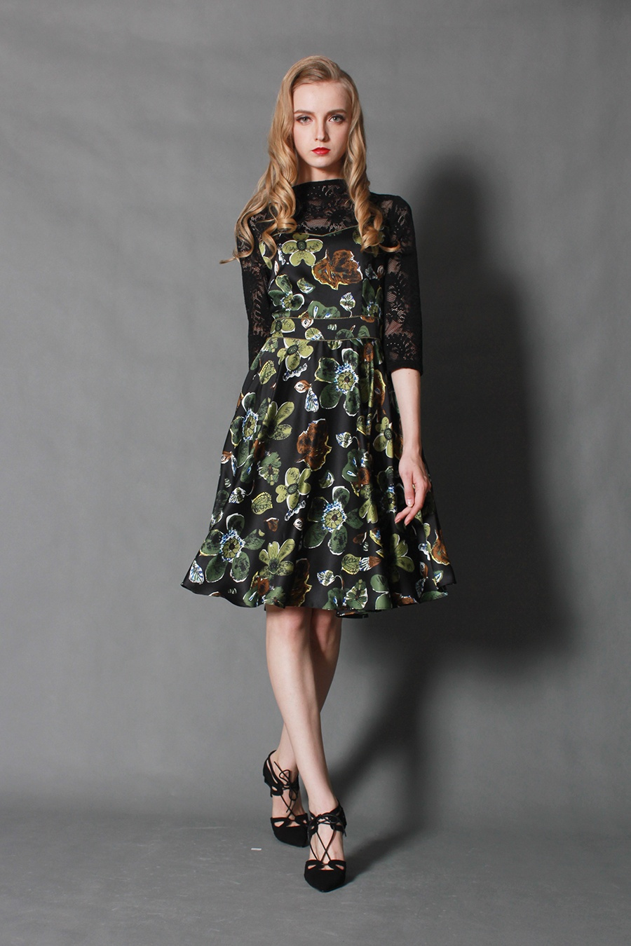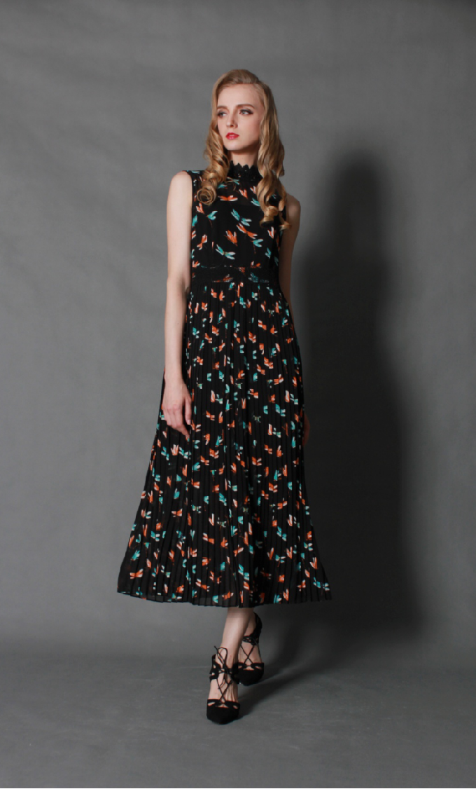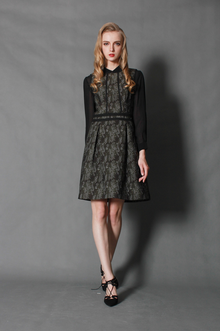 清新的的双色小蜻蜓图案错落排列,让你活跃的生命力迸发。领口及腰部精贴花边,恰到好处显出精致。下半裙压褶,让你紧随时尚潮流风。