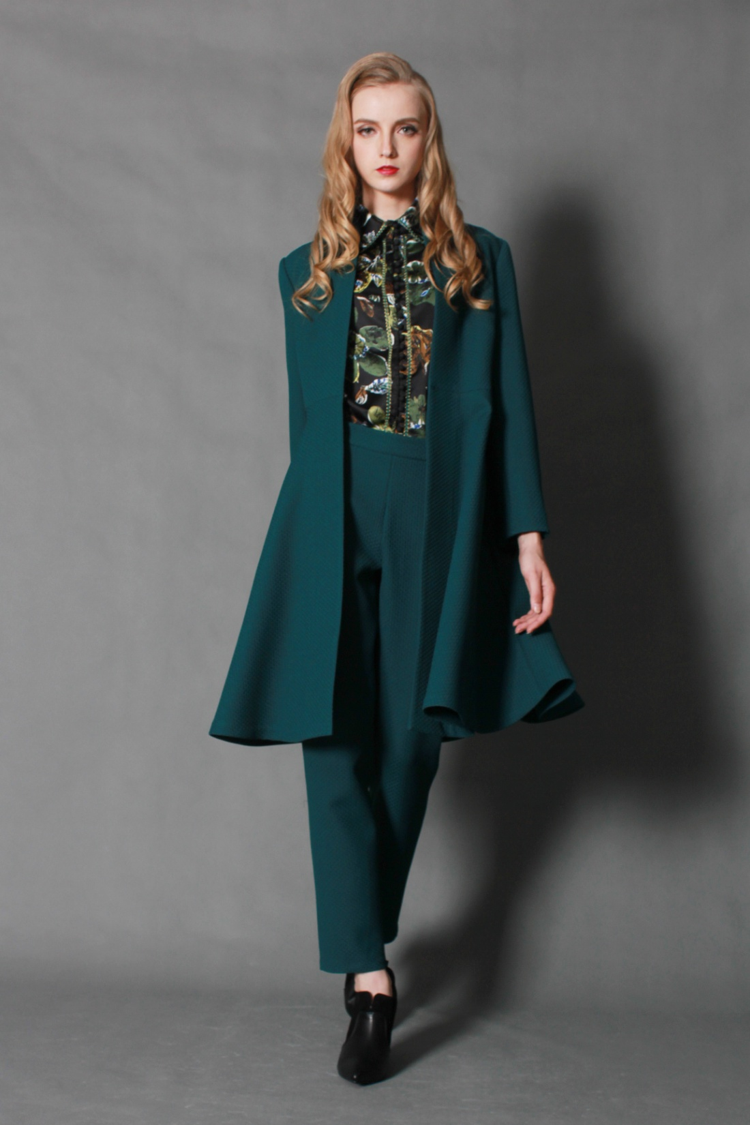 源自于1.7万年前法国拉斯科大厅洞窟壁画的墨绿色,内撞岩石灰,显出典雅华贵之气。柔软轻盈短貂毛料,让品质无可挑剔。超常规的衣长,让您的身材显得更加高挑。下摆开叉设计,显出你独到的大气。