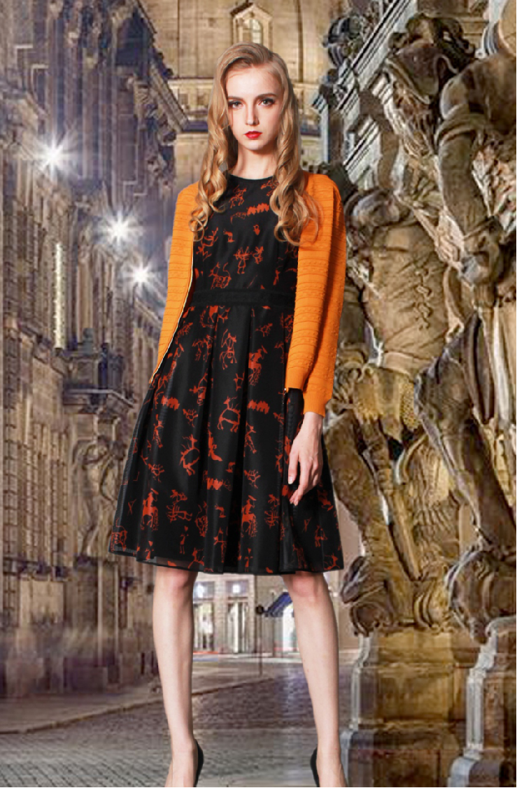 源自于1.7万年前法国拉斯科大厅洞窟壁画的赫锗红、岩石黄,恰到好处的点缀你的妩媚。略长的裙身,让你的端庄秀美紧跟当下时尚。精贴织带,点缀你柔美的腰线。