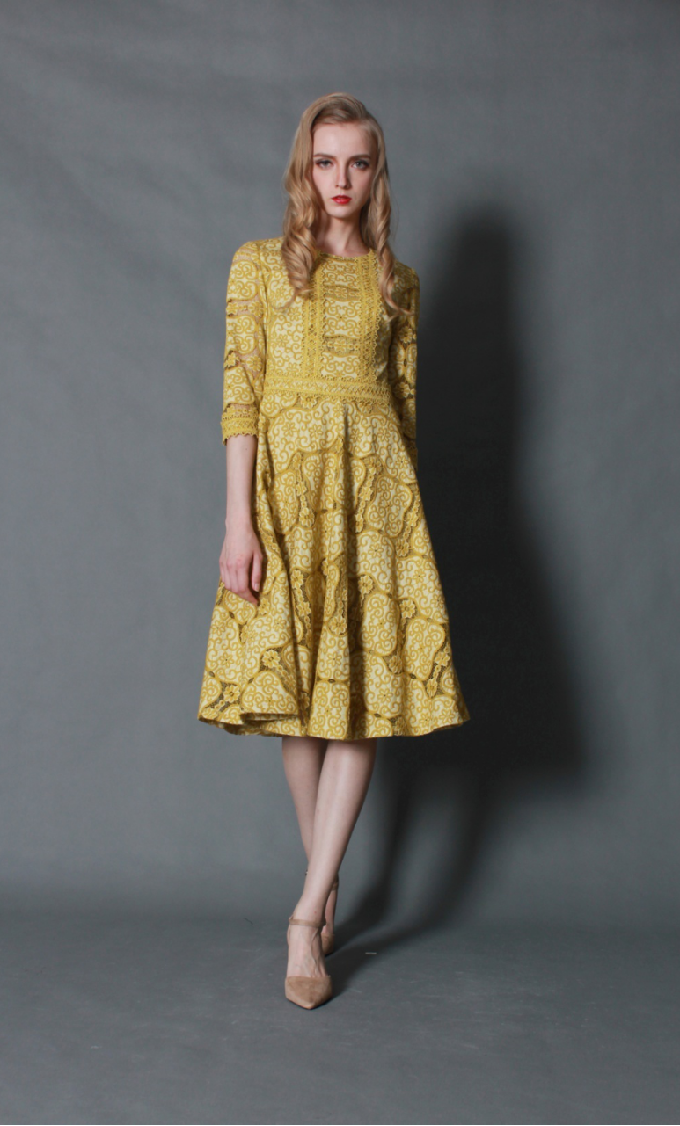 源自于1.7万年前法国拉斯科大厅洞窟壁画的岩石黄,示意你对艺术的钟爱。蕾丝精织,为你的性感代言,让你优雅中透露柔美的一面。领子袖口的精贴花边,显出你对精致的追求。,圆裁大摆的裙型,巧妙遮住肚腩,让您拥有飘逸时尚大牌气场。
