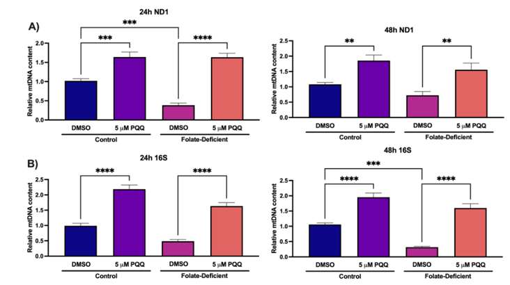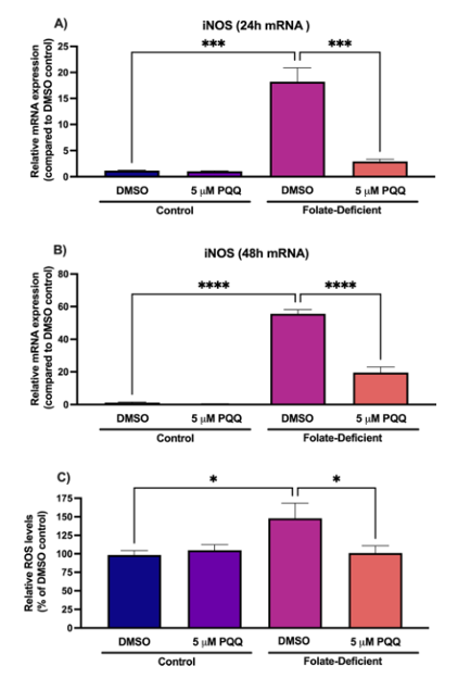 研究者还评估了叶酸缺乏对混合神经胶质细胞中诱导氧化应激反应的影响。与对照组相比,叶酸缺乏细胞中氧化应激标志物诱导一氧化氮合酶(iNOS)的基因表达显著且强劲地增加(24小时:约18倍,48小时:约55倍),PQQ处理(24和48小时)显著降低了这些影响。在评估ROS产生的变化时,与对照组相比,在叶酸缺乏条件下生长的细胞显示出细胞ROS水平显著增加,PQQ能够减轻这些影响,并将这些水平恢复到基线,显示PQQ起到抗氧化作用。