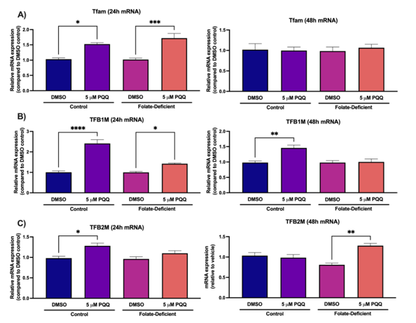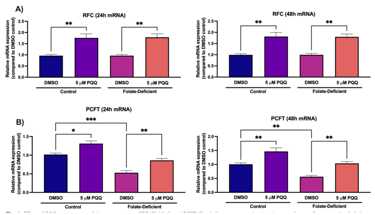 用PQQ(24和48小时)处理的细胞RFC和PCFT基因表达均显示出显著增加。在24小时和48小时处理后,RFC基因表达在对照细胞和FD细胞中均增加了约75%。24小时PQQ处理后,对照细胞和FD细胞中的PCFT表达增加约30%。在48小时的PQQ处理后,对照细胞和叶酸缺乏细胞中的PCFT表达增加了约50%。