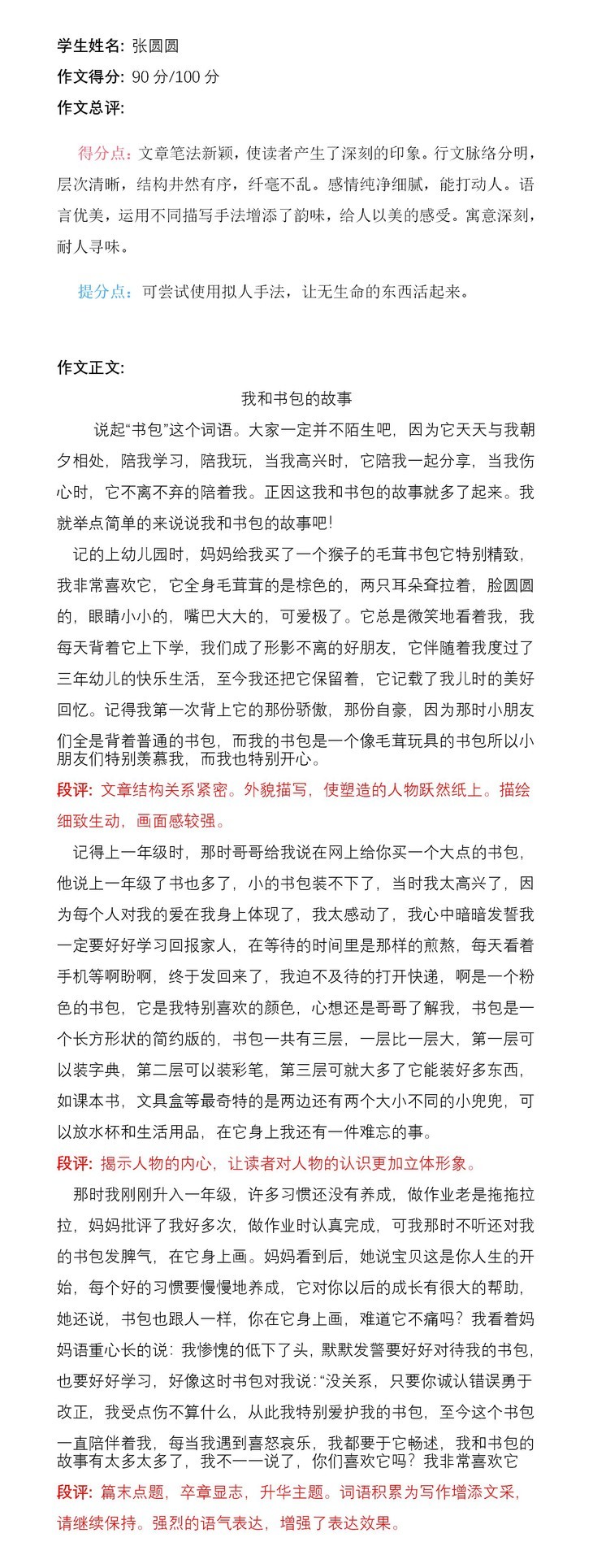 正如文章题目,小作者和书包之间的确存在着故事,而且这故事细细品味颇让人感动!相信读到它的人都有同感,文章首尾呼应,先描写了书包的外形,接着用充满真情的文字叙述了自己和书包之间的两个小故事,结尾呼应开头,突出作者和书包之间的故事,升华主题,激荡情感,是一篇佳作哦!