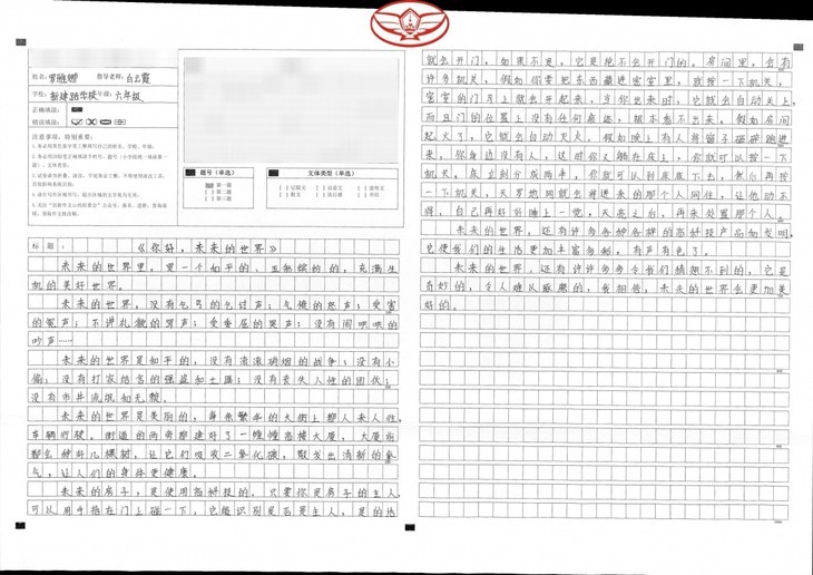 我喜欢想象未来的世界是怎样的?一看到这次作文的标题,可以让我充分发挥想象,所以我就拿起笔来准备发挥,因为未来的世界是难以琢磨的,令人猜想不到的,也是奇妙的,在这篇文章中,想到有一些小偷,如狐狸般狡猾,什么方法都能想到,于是我就写了这个高科技房子,我把平时积累的好词好句都用上,这样,完成了这篇《你好,未来的世界》。