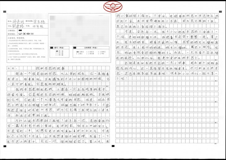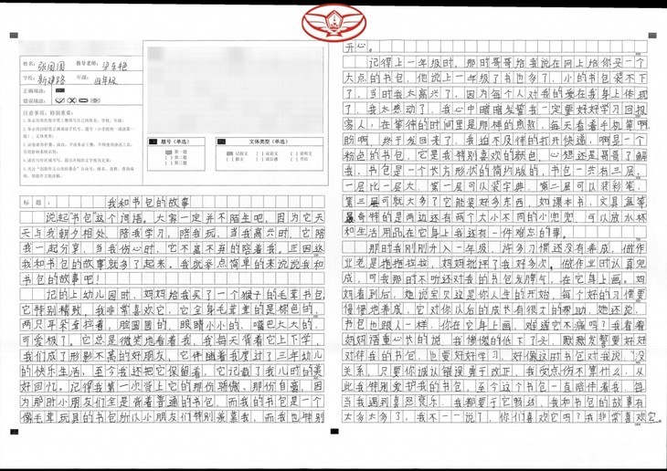 当我拿到《我和书包的故事》这个参赛作文题目时,就想到了我从上学至今一直在用的小兔子书包。我是这样构思的,首先我从书包的外形特点、颜色进行了描述,又从我和书包之间所发生的一系列有趣的故事进行了描写。我记得爸爸要给我买个新书包,我说不用买,别看它旧了,可是我和它有着特别的情感。因为,书包里装满了知识,装满了智慧,让我收获满满,它是我永远的好朋友,我特别喜欢我的小免子书包。