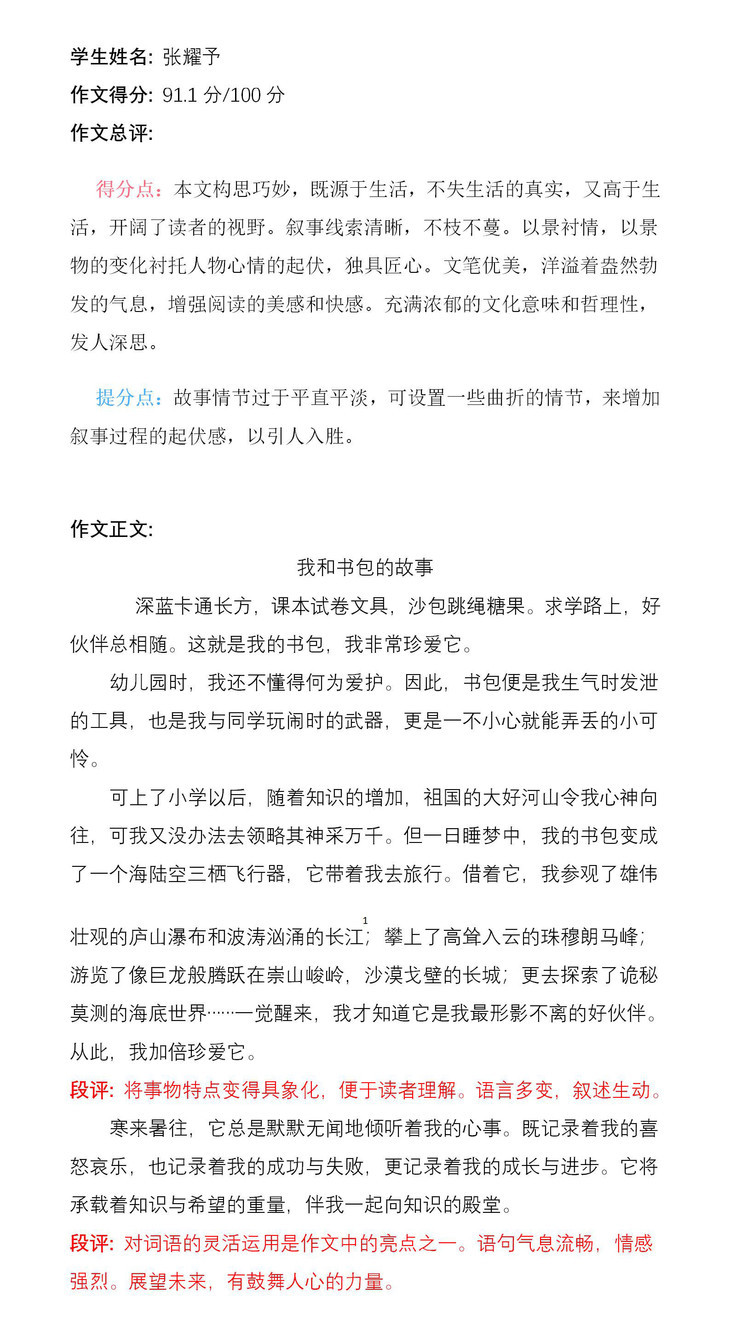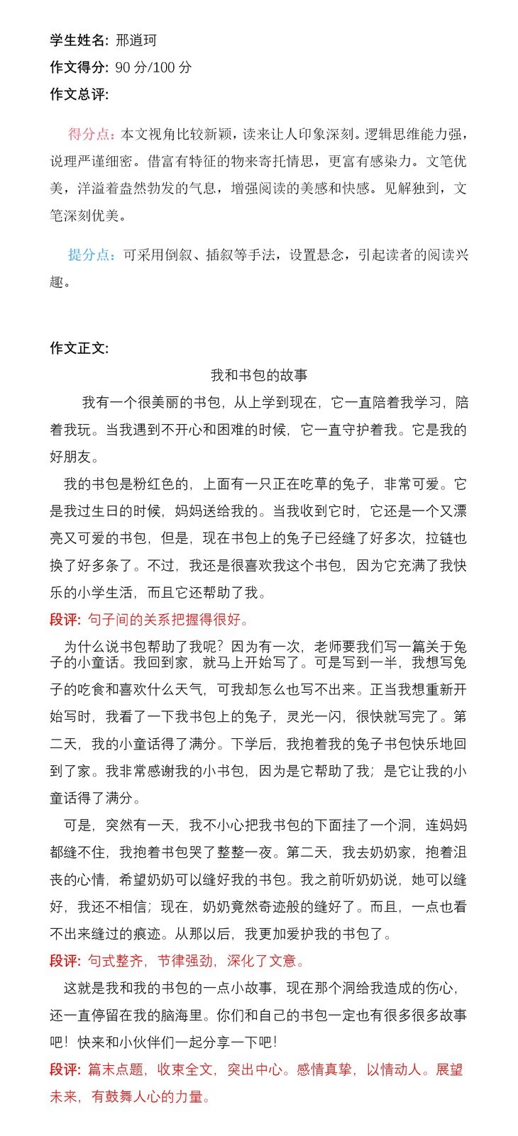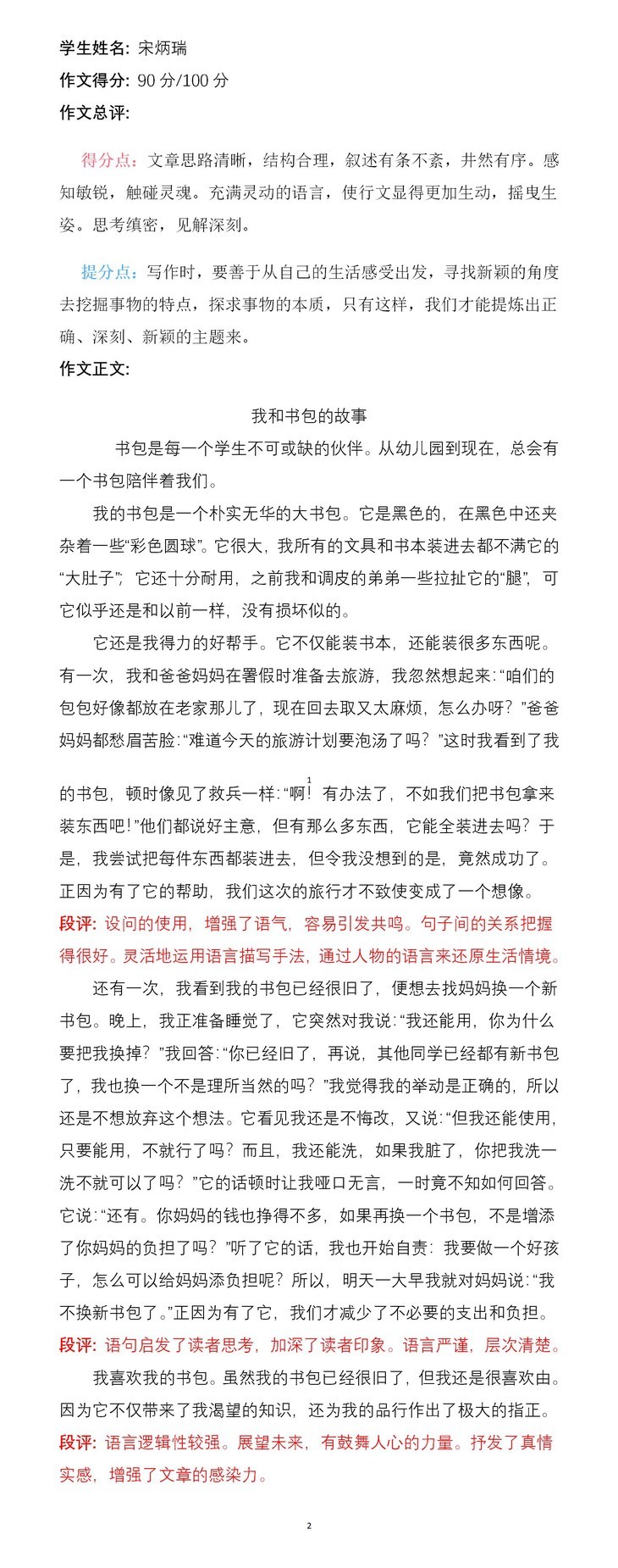 宋炳瑞,四年级一名勤奋好学,热爱读书的同学。记得刚转学来班里时炳瑞给我们留下了非常独特的印象:课堂上答案在胸却从不轻易举手,班级里满腔热情却从不启齿表白,在“小练笔”“写作小明星”等习作练习中,让我们对他有了更深的认识。每次的练笔他都认真对待,构思非常新颖,文笔也很流畅,内容时而特接地气,时而又天马行空,时而满文童趣,时而又沉重深刻,每次的范读都能赢得全班同学们的掌声和喜欢。比如这篇以“书包伴我成长”为主题的作文,文章感情真挚,健康,充沛,语言朴实不失清新,流畅自如又生动有趣,结构条理清晰,首尾呼应,文章形成一个有机的整体,读来感受至深,很吸引读者!是一篇深受同学们喜欢的作文!最后老师想对炳瑞说:学习如大海行舟,唯有坚持不懈,顽强拼搏,才有驶向金色海岸的可能。老师希望你能勇敢面对学习的困难,相信自己的能力,始终洋溢写作的热情,有一天,你终会驶向理想的彼岸!