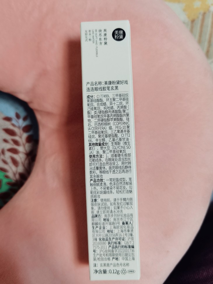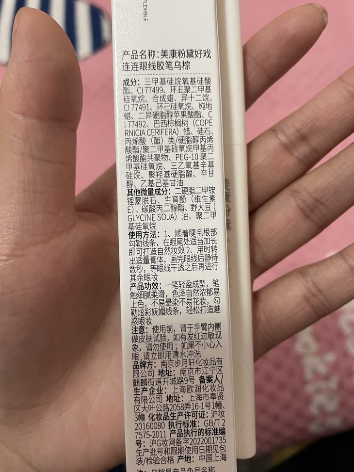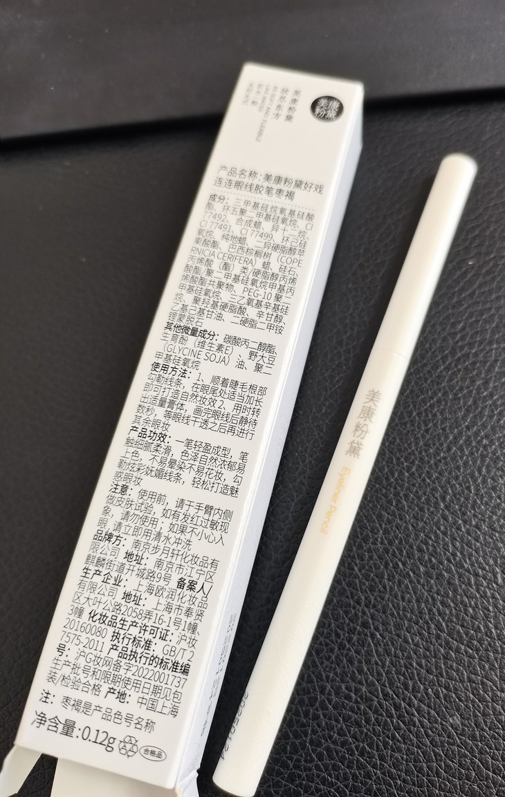 美康粉黛好戏连连眼线胶笔我真的一整个爱住,首先,这个包装一如既往的简洁,清新的感觉。 其次,它的质地顺滑也不卡纹,正好能避免拉扯眼部娇弱的皮肤,并且我看成分也不错,可以避免眼部刺激。这款眼线笔好像防水防汗,因为我用水没搓掉,姐妹们可以不用担心晕妆,适合夏天用。更重要的是只要一杯奶茶钱,物美价廉,值得购买。希望美康做出更好的产品。