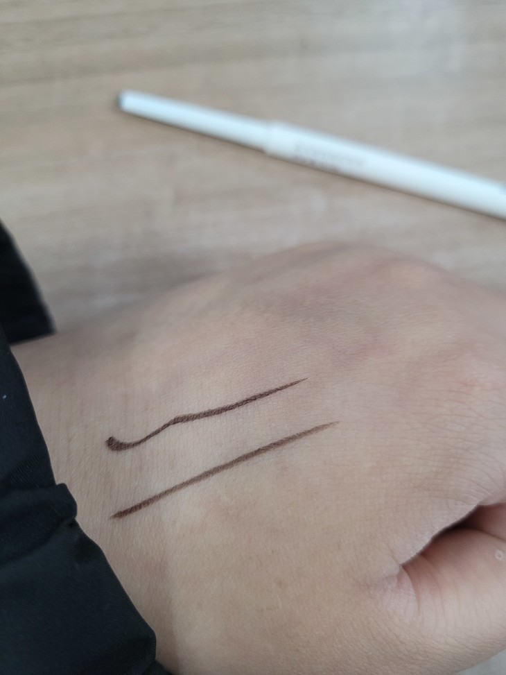 慕斯质地的感觉“超级顺滑”软硬适中,不会画到一半中断,显色度刚刚好,对眼线小白真的太友好啦 而且它的持久度也很不错,到晚上回来卸妆的时候眼线也不会晕染,遇到水和汗也不会融化掉,绝绝子~❤️ 比我上次入手的眼线笔好多了,这款是升级的,价格也超级平价,学生党可以轻松入手啦~
