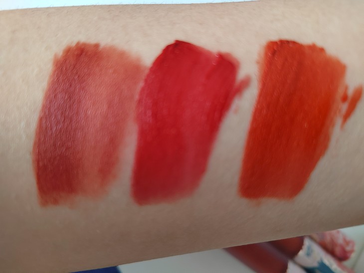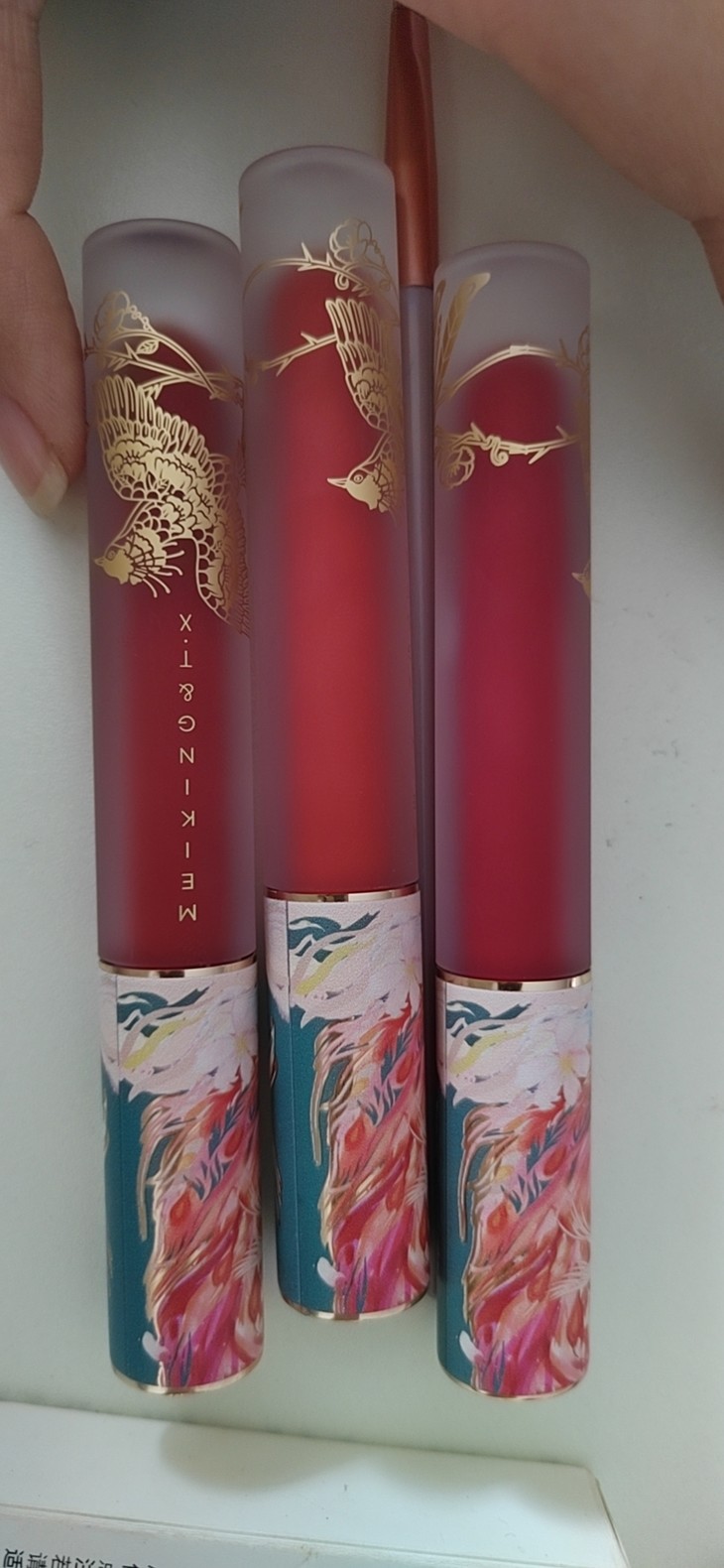 首先外包装很有质感,瓶身是磨砂的,很高级,然后上面是金属的,还印有凤凰图案应该是,其次刷头是s型的,就能很好照顾到我们的嘴唇的形状,然后质地就很糯,涂抹上后十分舒服,最后说一下我买的三个颜色,幻想盛宴是偏橘调的并且带细闪,很显白,个人觉得很适合春夏,然后恋爱副本是带一点梅调的,涂上就是白雪公主,然后天生聚光是红棕色调的,十分显气质,下附试色图从左往右依次为天生聚光,恋爱副本,幻想盛宴(可能因为光线,可能跟自己实际看到的稍微有些区别)