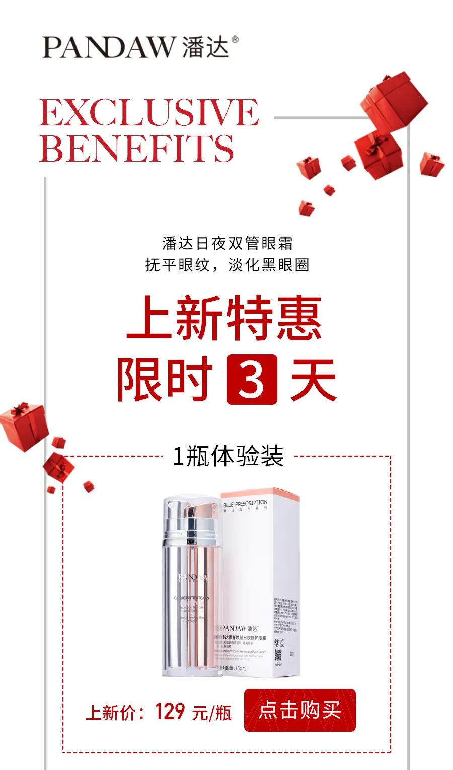 潘达这款日夜双管眼霜,不管是配方体系,还是使用效果,真的是用了极大的诚意;如果你也经常被眼纹、黑眼圈困扰,真的不妨试一试它。