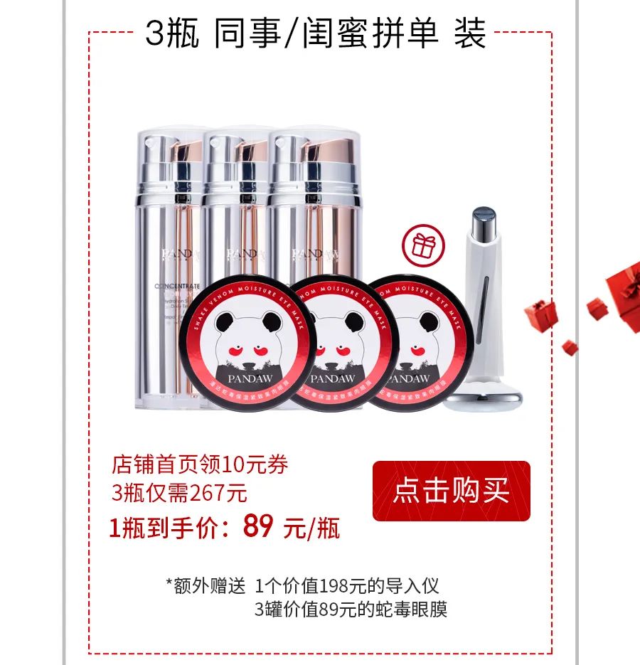 这次我们还给大家申请到了特殊福利,跟同事/闺蜜拼单3瓶装,立省180元(日常价149元/支)并额外赠送价值198元的全脸导入仪一台,以及价值267元的蛇毒抗皱眼膜3盒。