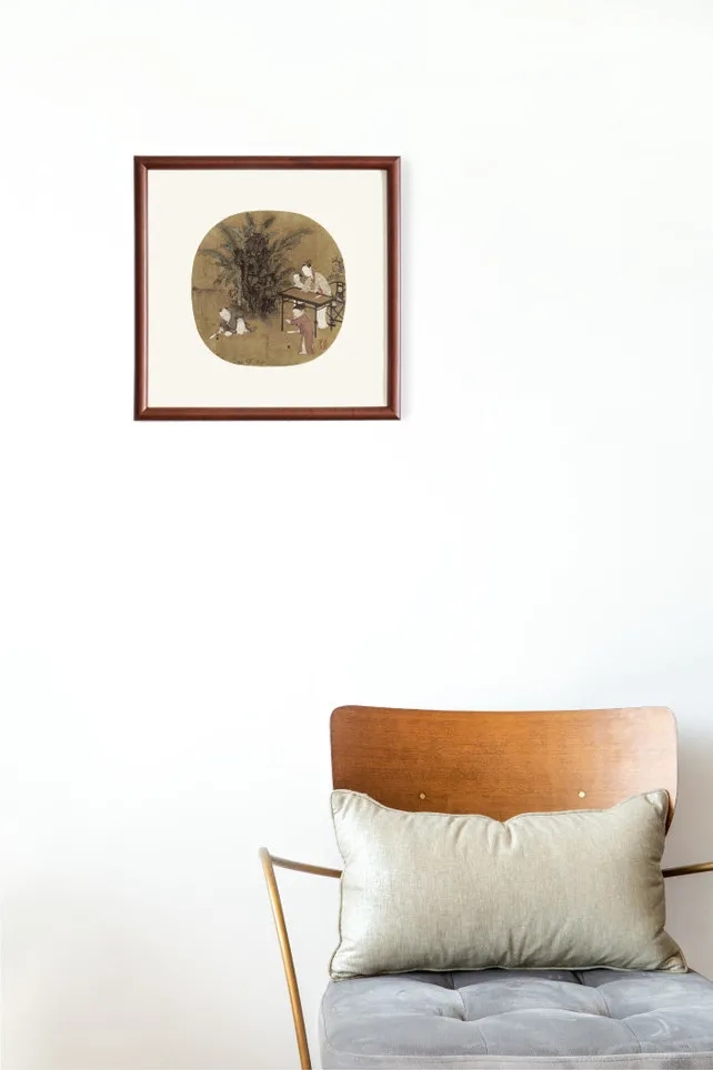 此图描绘的是文人雅士所向往的闲适生活。长松掩映之下,长案临窗,清风徐来,窗外传来书童打扫落叶的声音,间或闻得几声鸟鸣,宁静悠闲,倚案展卷,何等惬意。