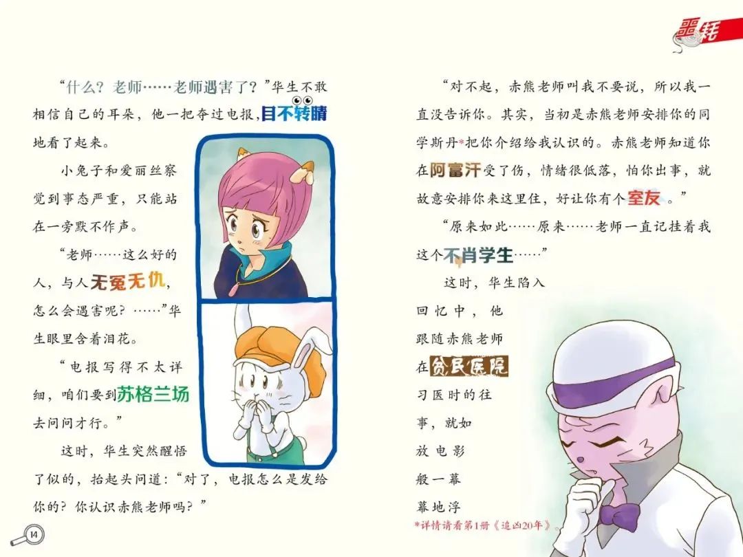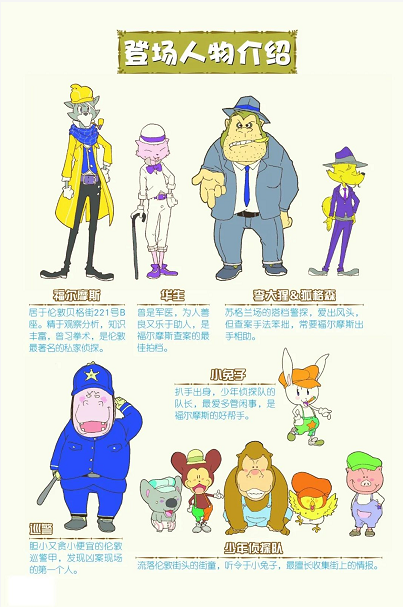 除了情节上面的儿童化处理,人物形象也都换成了各种动物。福尔摩斯是一只犬、华生是一只猫,小说里还有猩猩、狐狸、小猪等小动物。比起记住各种人脸,小动物的模样显然更容易被小孩子识别和记下。