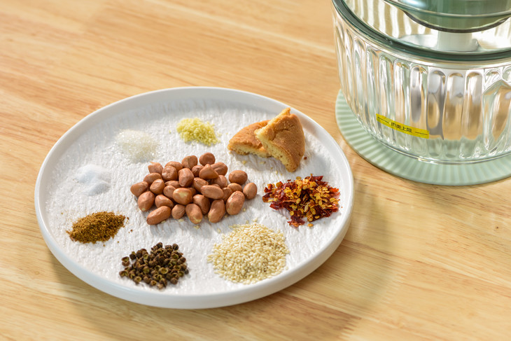1、将所有食材全部放入绞肉机,选择“2档” 模式搅打5秒即可。