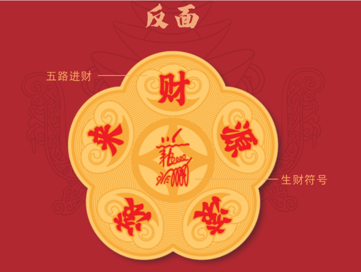五颗元宝迎合东南中西北五方,象征着五方财神、五路进财,铜钱镇守中央,寓意财源滚滚,荡漾的水波纹象征着财富的长久凝聚、持久不衰;