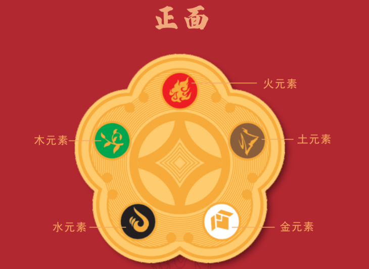 金卡正面是五行元素的集锦,表达了五行的相生循环信息和能量运行规律。