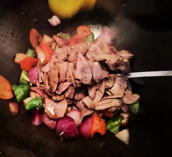 2、锅中留稍许底油,葱,姜,蒜片入锅煸香,放入木耳,胡萝卜片,柿子椒块炒匀,添1勺料酒,1勺生抽,半勺老抽,1捏盐,猪肝炒匀;