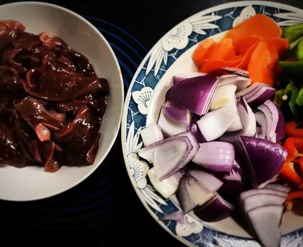 猪肝半斤(肝尖部分),木耳,胡萝卜片,柿子椒块;