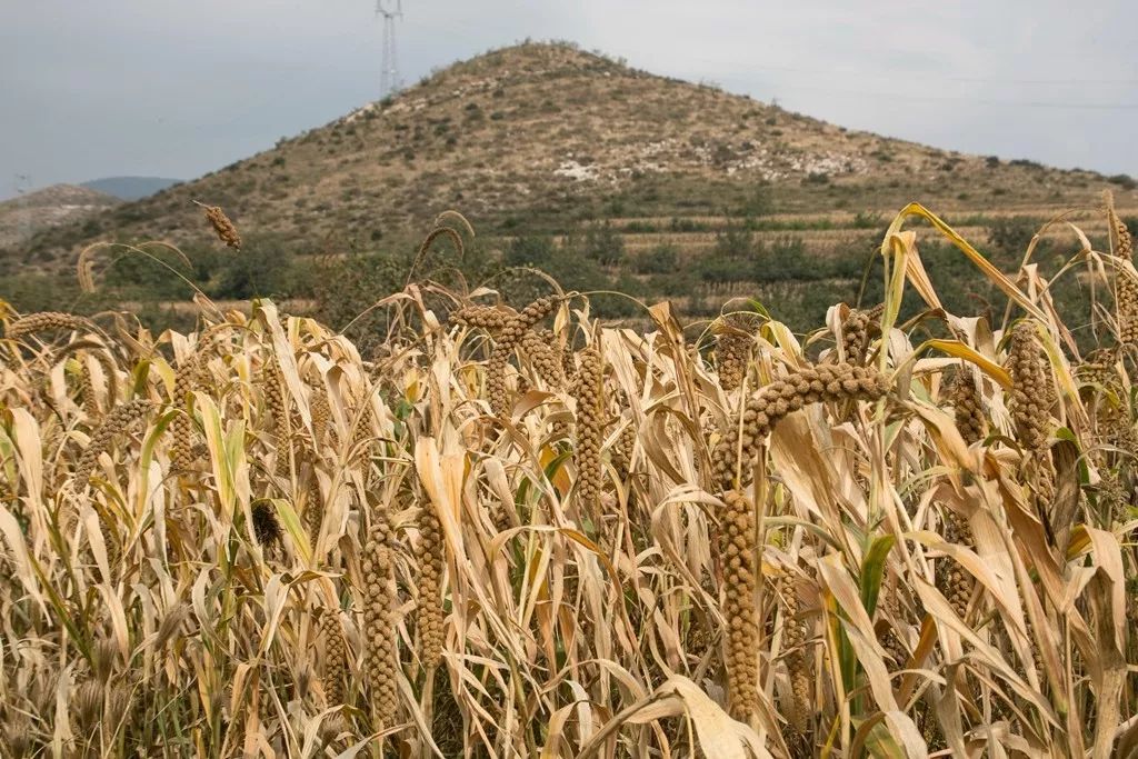 收割的小米需要晒干,再用石碾子碾着脱粒,之后再“扬场”。