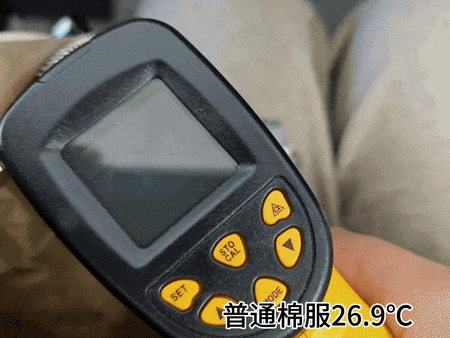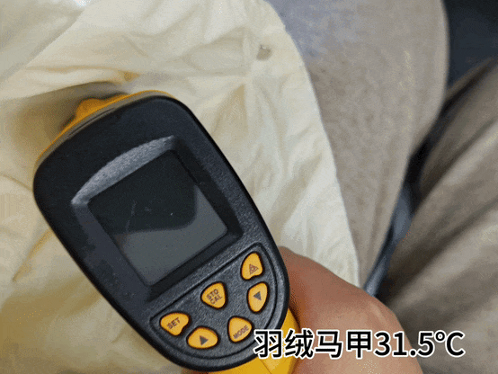 把羽绒马甲和普通棉服分别穿上10分钟,测试温度。羽绒马甲温度为31.5℃,普通棉服温度为26.9℃,羽绒马甲保暖更胜一筹!