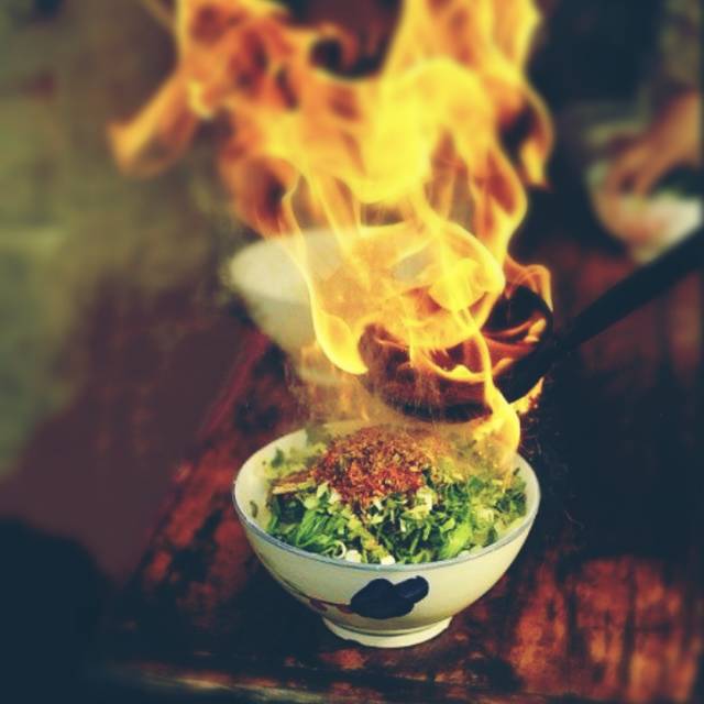 油泼面的重中之重就是 “ 油泼 ”,油要豆油或者花生油,泼时要用大勺泼入,有一种酣畅淋漓的快感。