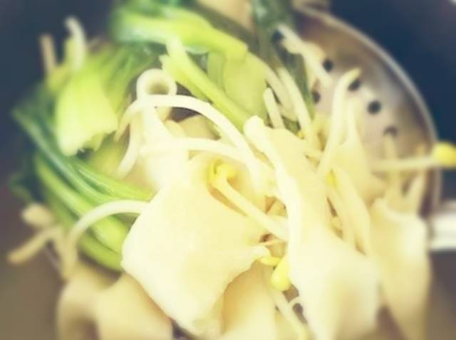 1、将面条放入锅中大火煮开,起沫时点入凉水,待面条漂浮水面时,放入黄豆芽1两,油菜半颗,少许圆白菜后捞出过凉,盛入大碗中;