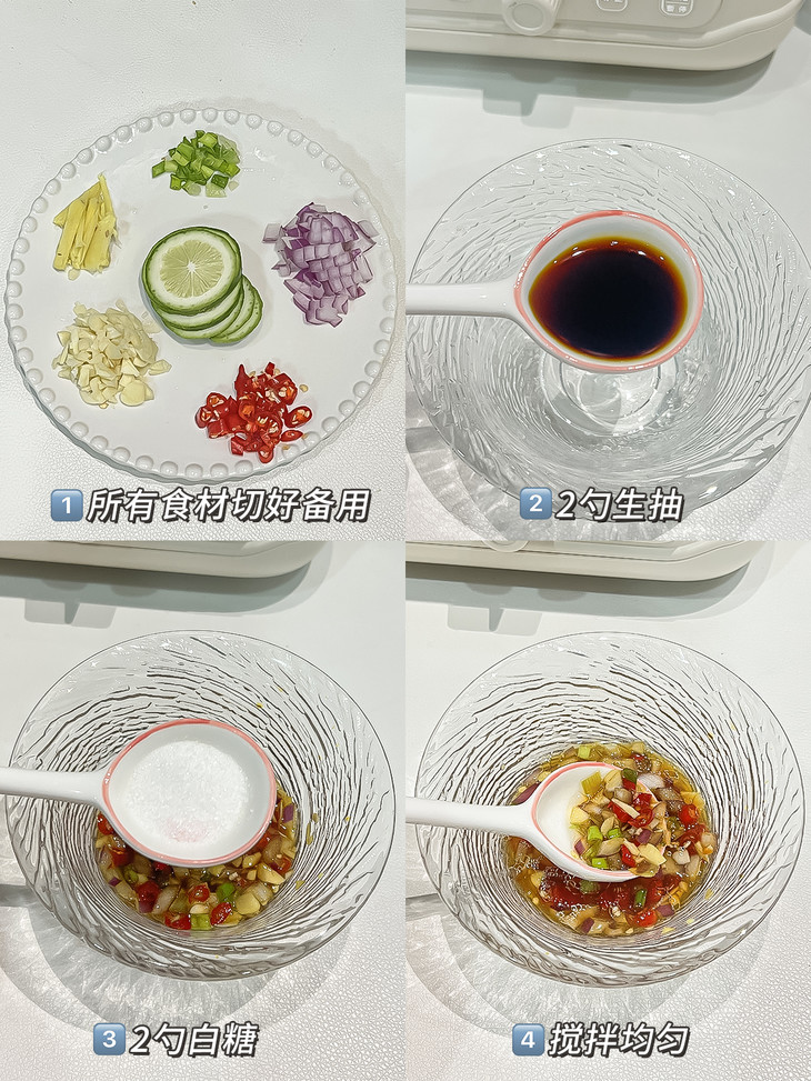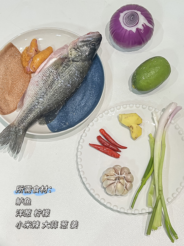 1、姜切丝、香葱、蒜、洋葱、小米辣切粒,柠檬切片