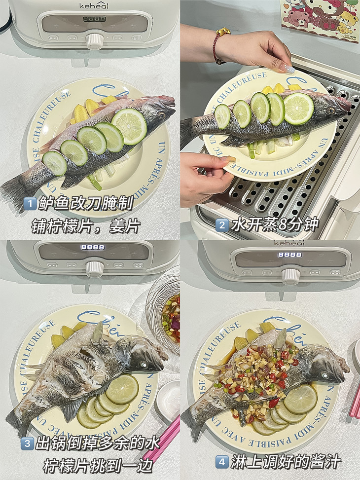 4、将柠檬片和姜丝塞入鲈鱼中。蒸锅中放入适量水,选择“速蒸模式”蒸8分钟