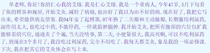 单老师,你好!你的仁心我的艾缘.我是仁心艾缘.我是一个重病人,今年47岁,3月下旬看了你的博客和视屏,开始艾灸.减轻了病痛,也调理好了我以为调理不好的病.现在好了,我把它写出来,希望能供病友借鉴.我04年安了起搏器,07年换了二尖瓣和主动脉瓣,长期服用利尿药,副作用太大,也吃过中药,不能停药,一停就脸肿腿肿.我开始艾灸,把所有腹部的穴位包扩我能够着的穴位,通通灸了个遍,当天没啥事,第二天,小便量很大,我高兴啊,可以不吃利尿药了,到现在3个多月了,我没吃过利尿药,完全不用吃了.我每天都艾灸,象是我的一项必修课.下次,我在把其它的艾灸体会在写上来.
