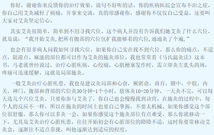 也会有很多病人问我如何寻找穴位,如果你自己实在找不到穴位,那么你的痛点,不适点,阻滞点、麻涨的部位都可以作为艾灸的施灸部位。我也常常看《马氏温灸法》这本书,马老就曾经说过,调理心脏疾病,心绞痛,心肌梗塞发作时,需立即灸左乳头四周,疼痛可迅速缓解,这就是局部施灸。
