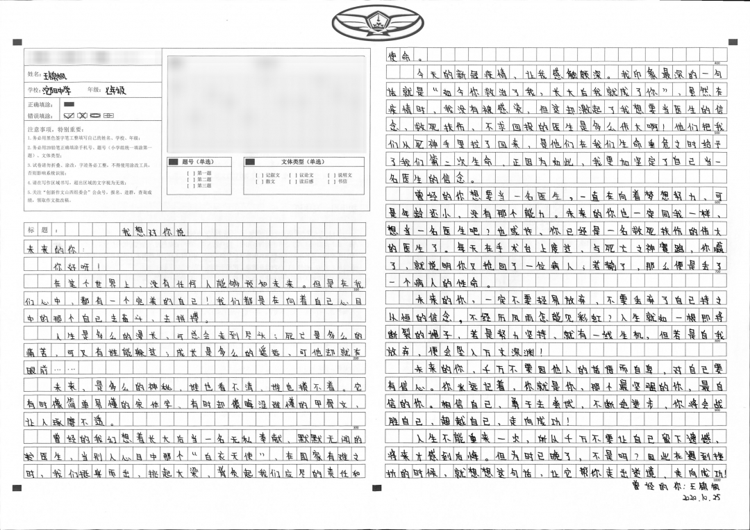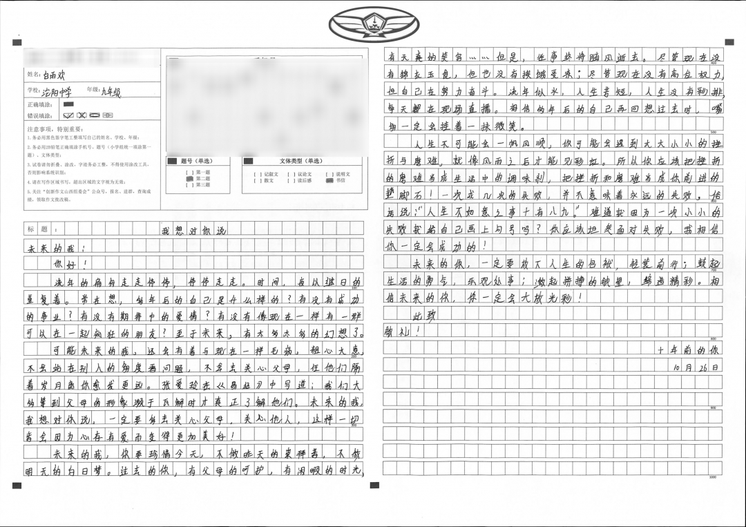转眼间,心中会有很多话想对未来的自己说 ,有过遗憾和后悔,但也有开心,我想通过这次的作文主题,来弥补之前的缺陷,时光过得飞快,未来的我,也许和现在的我爱好不同,我将它写进作文,我愿自己可以顺利的成长。