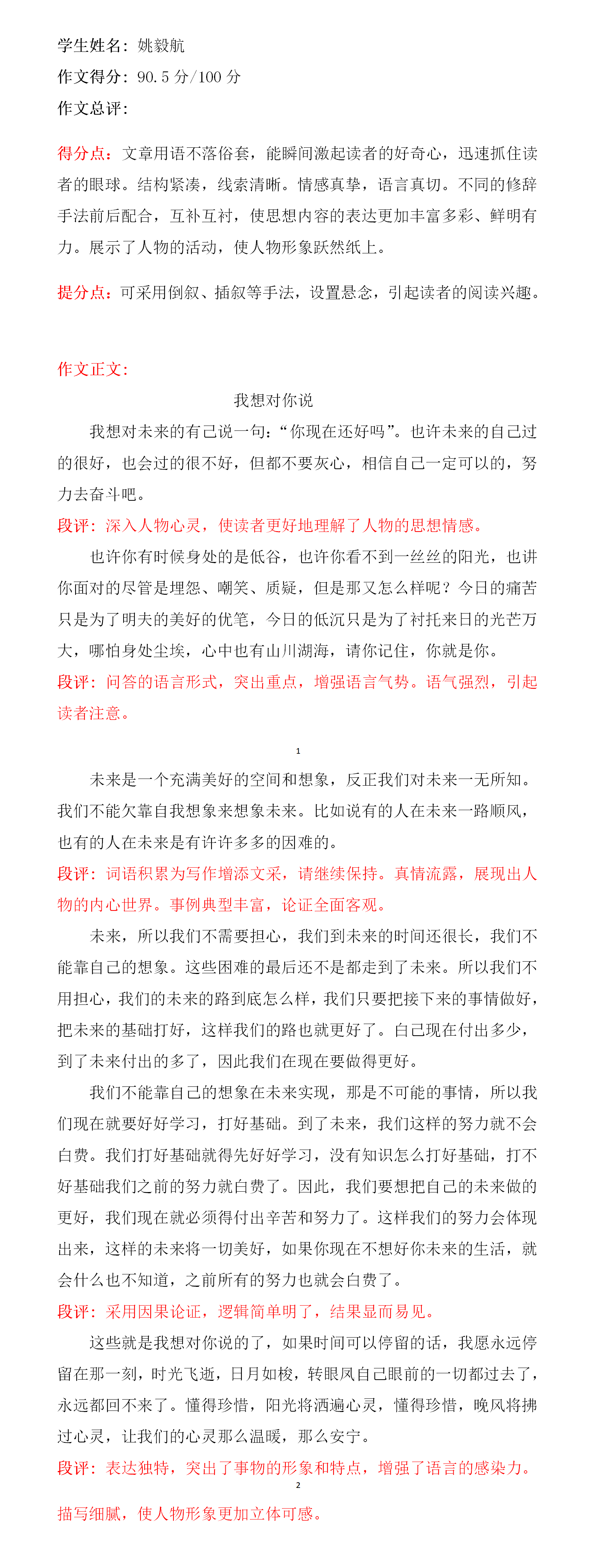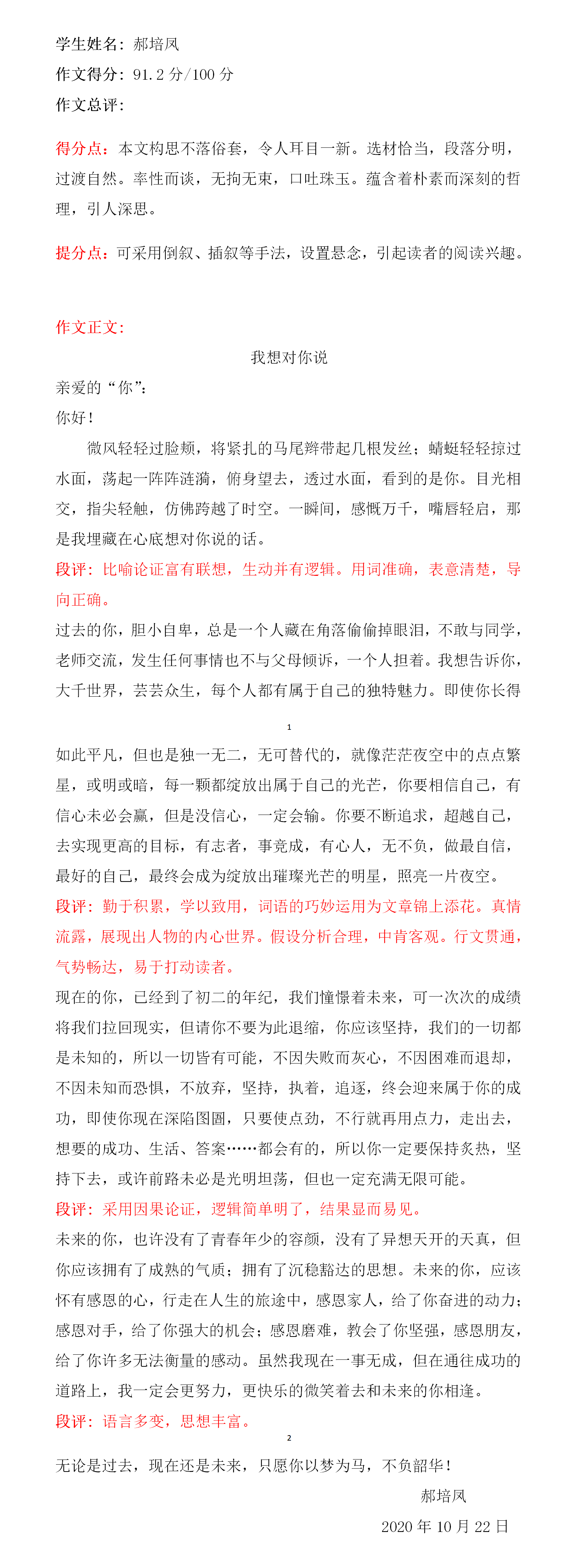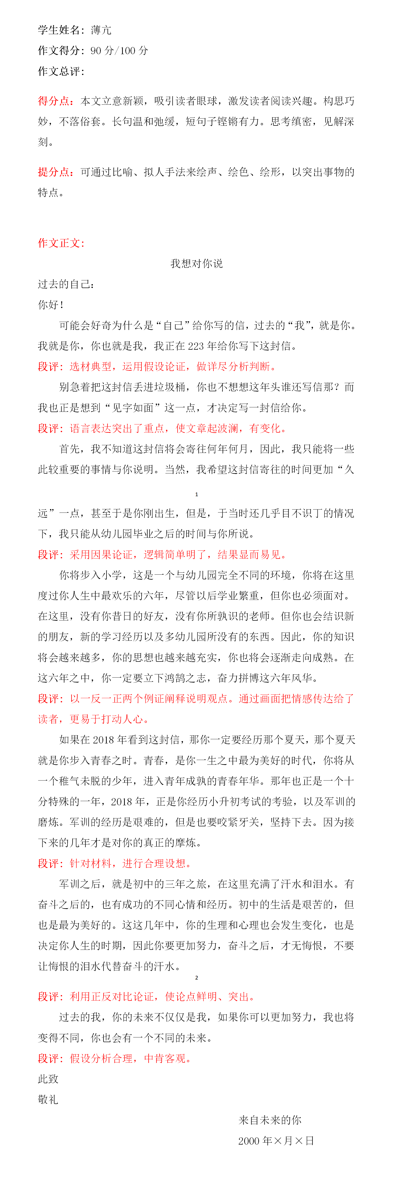 这封信构思合理,很有时代气息。作文一开头简明扼要地写明了写这封信的缘由,语言切合实际,朴素而深刻,尤其是第一段最后一句,点明写作意图;接下来结合实例回顾了过去的自己,懵懂无知、懒散任性,对人生没有准确的定位,没有梦想,更缺少行动,紧扣“我想对你说”,字里行间流露出对过去的自己的悔恨与不满;最后展望未来的自己,勉励自己鼓足勇气,勇于担当,做新一代的好少年!全文语言张弛有度,将原本俗套的选材写出新意。文能怡情,文能言声。 相信小作者的这篇习作会引领他更上一层楼,对人生的感悟会启迪他走向一片光明!