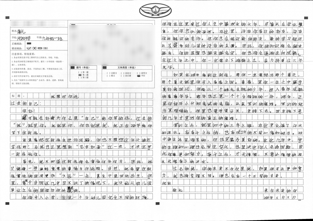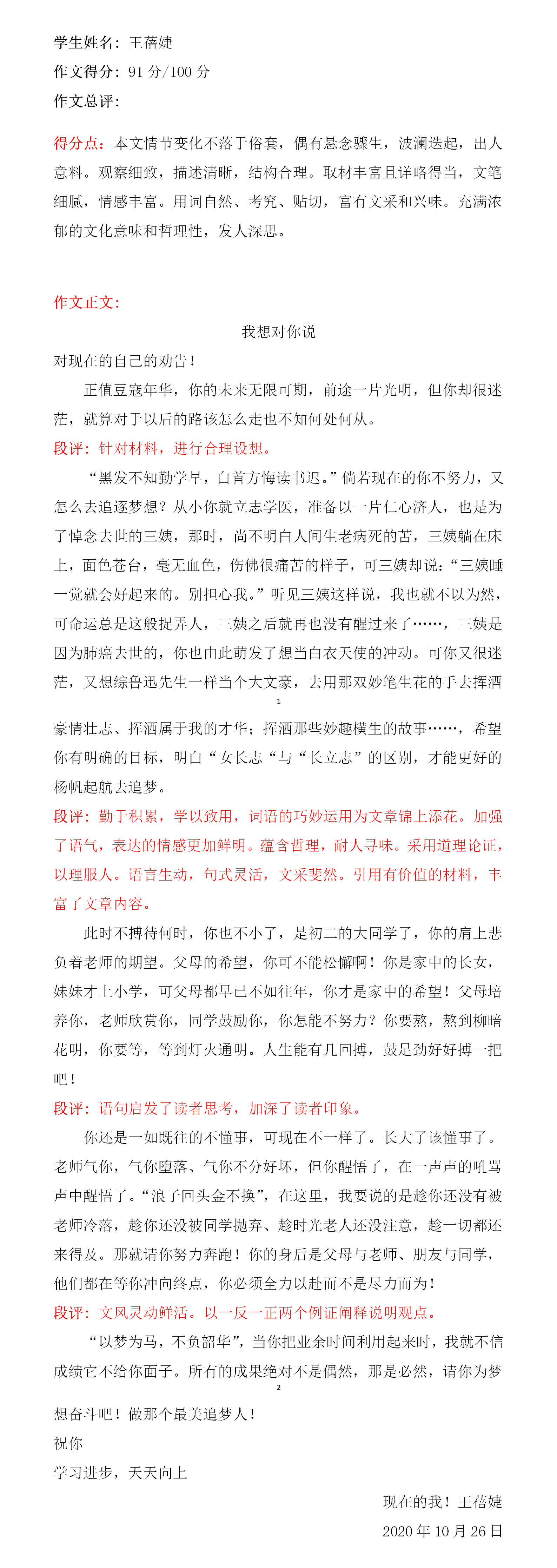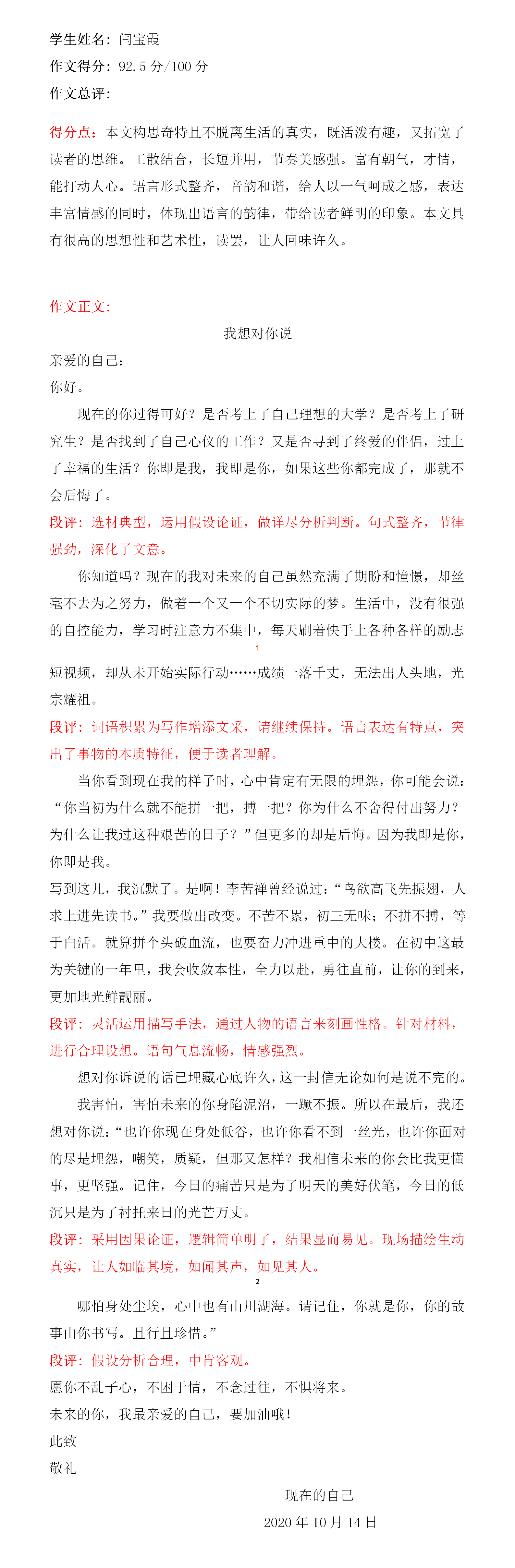 这封信构思合理,很有时代气息。作文一开头简明扼要地写明了写这封信的缘由,语言切合实际,朴素而深刻,尤其是第一段最后一句,点明写作意图;接下来结合实例回顾了过去的自己,懵懂无知、懒散任性,对人生没有准确的定位,没有梦想,更缺少行动,紧扣“我想对你说”,字里行间流露出对过去的自己的悔恨与不满;最后展望未来的自己,勉励自己鼓足勇气,勇于担当,做新一代的好少年!全文语言张弛有度,将原本俗套的选材写出新意。文能怡情,文能言声。 相信小作者的这篇习作会引领他更上一层楼,对人生的感悟会启迪他走向一片光明!
