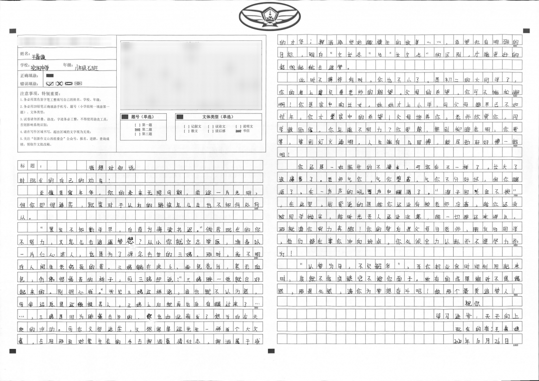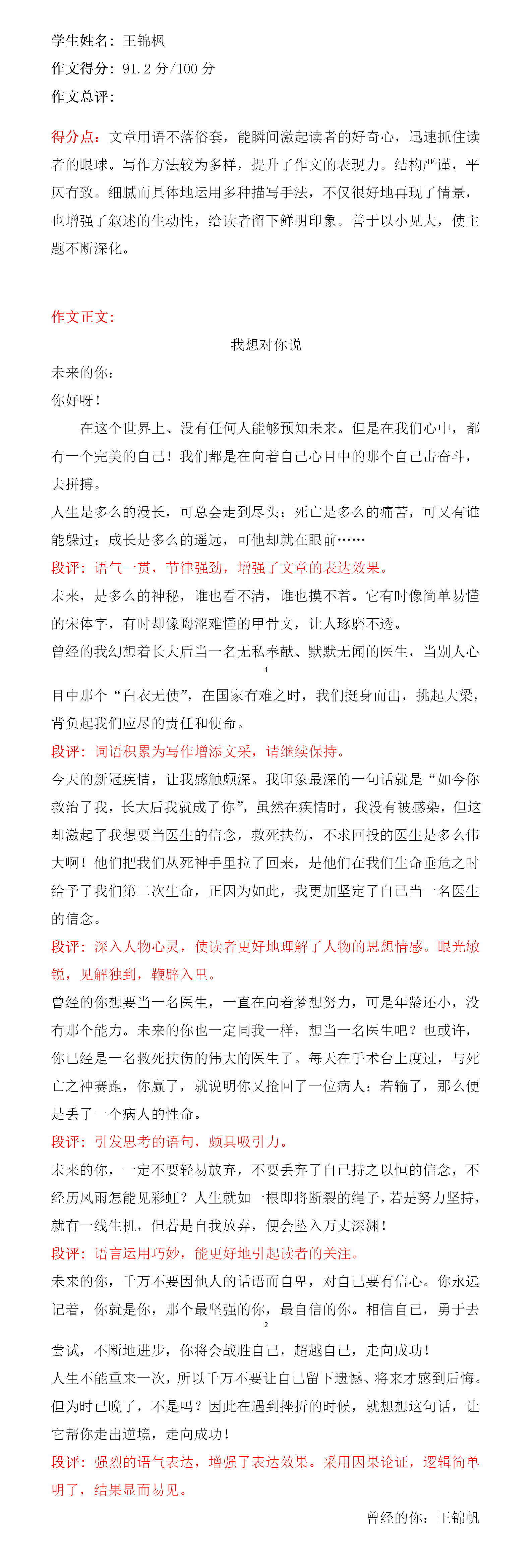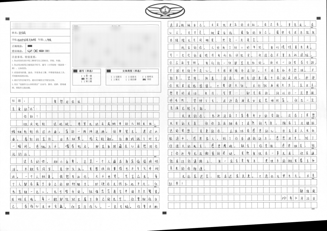 你是一个坚毅而聪颖的孩子,想象力丰富。老师希望你能乘着这次创新作文的东风,乘风破浪,在写作之路上收获满满!加油!老师一路支持你!