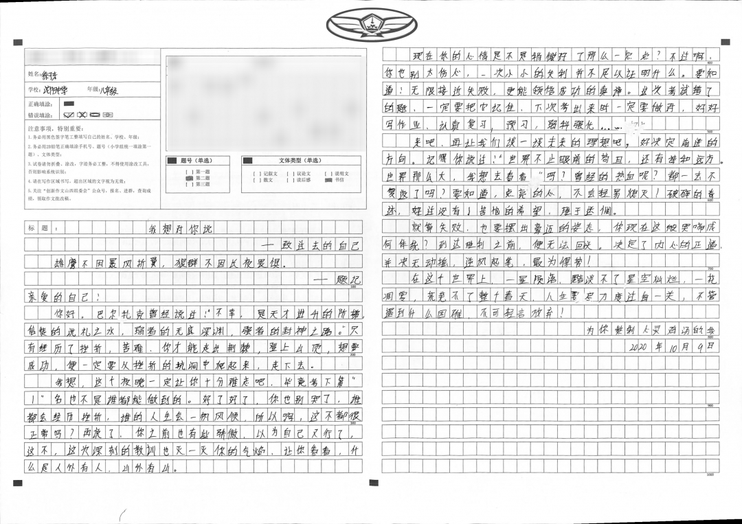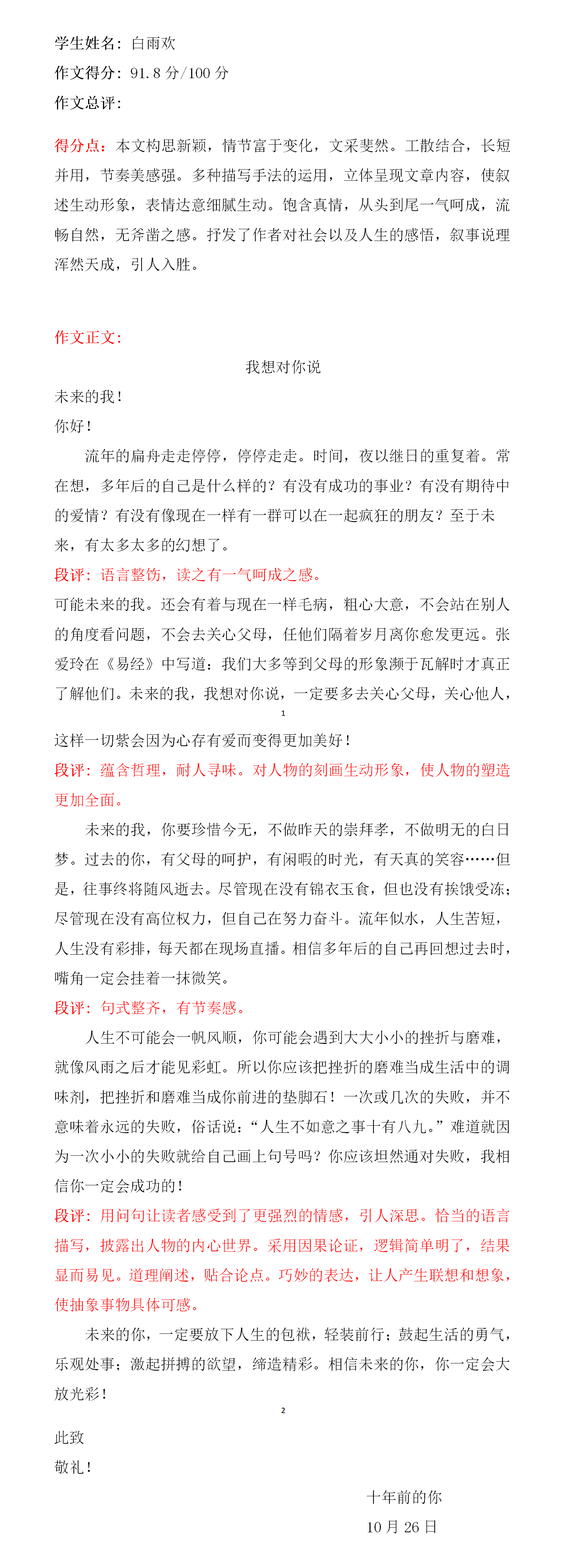 时间总是像白驹过隙一样快速离去,不经意间,我们就长大了。回顾往年,也许会有惊喜,也许会有遗憾,但是我们可以写一封信给过去的自己,现在的自己,未来的自己,我们的心里会多一点慰藉与希冀。首先讲明了写这封信的原因,其次回顾过去,接着是对未来的美好期盼。通过这次作文活动,我对成长有了更多感悟,放眼未来,要对自己充满信心,不惧风雨,砥砺前行!